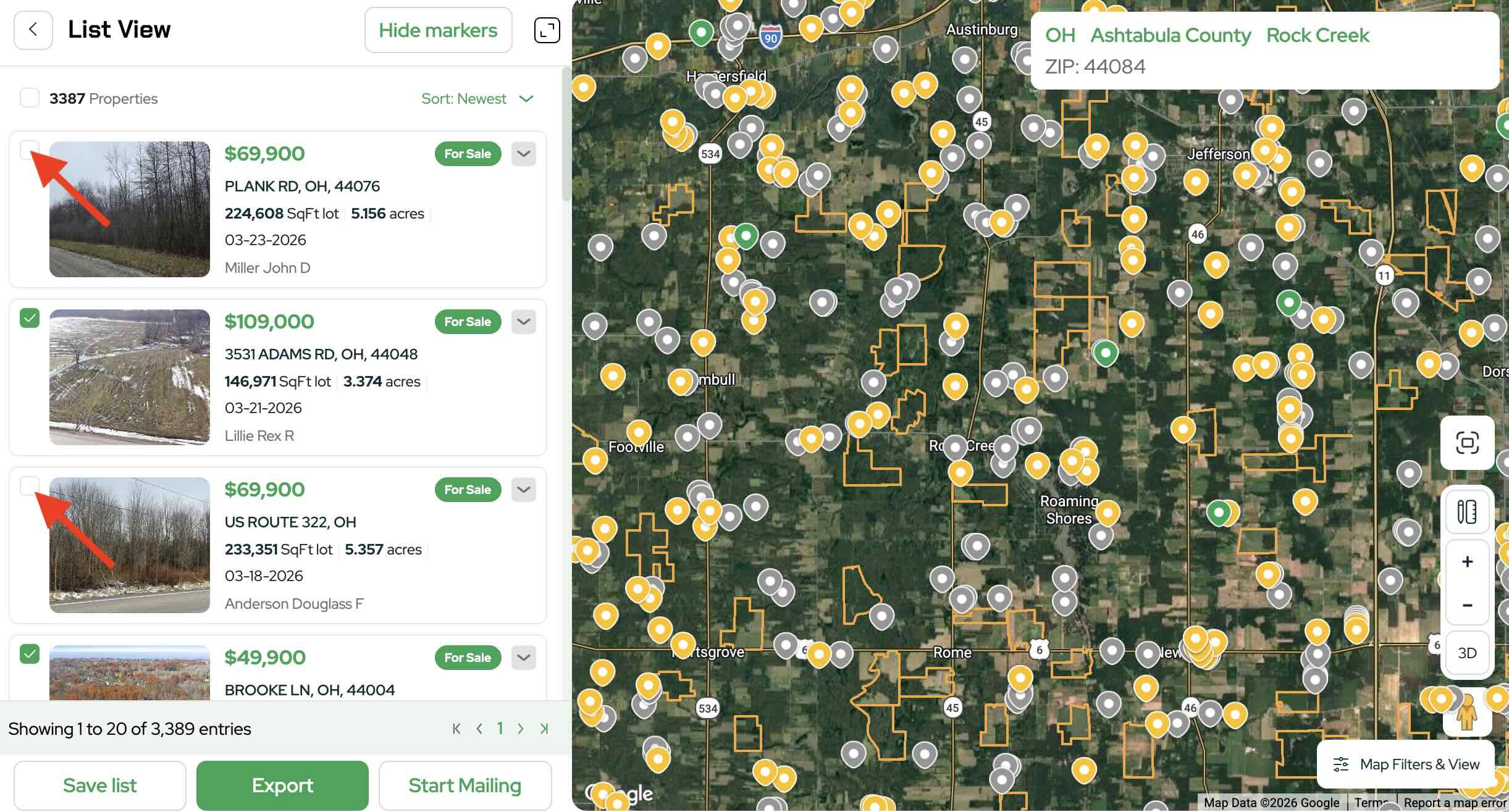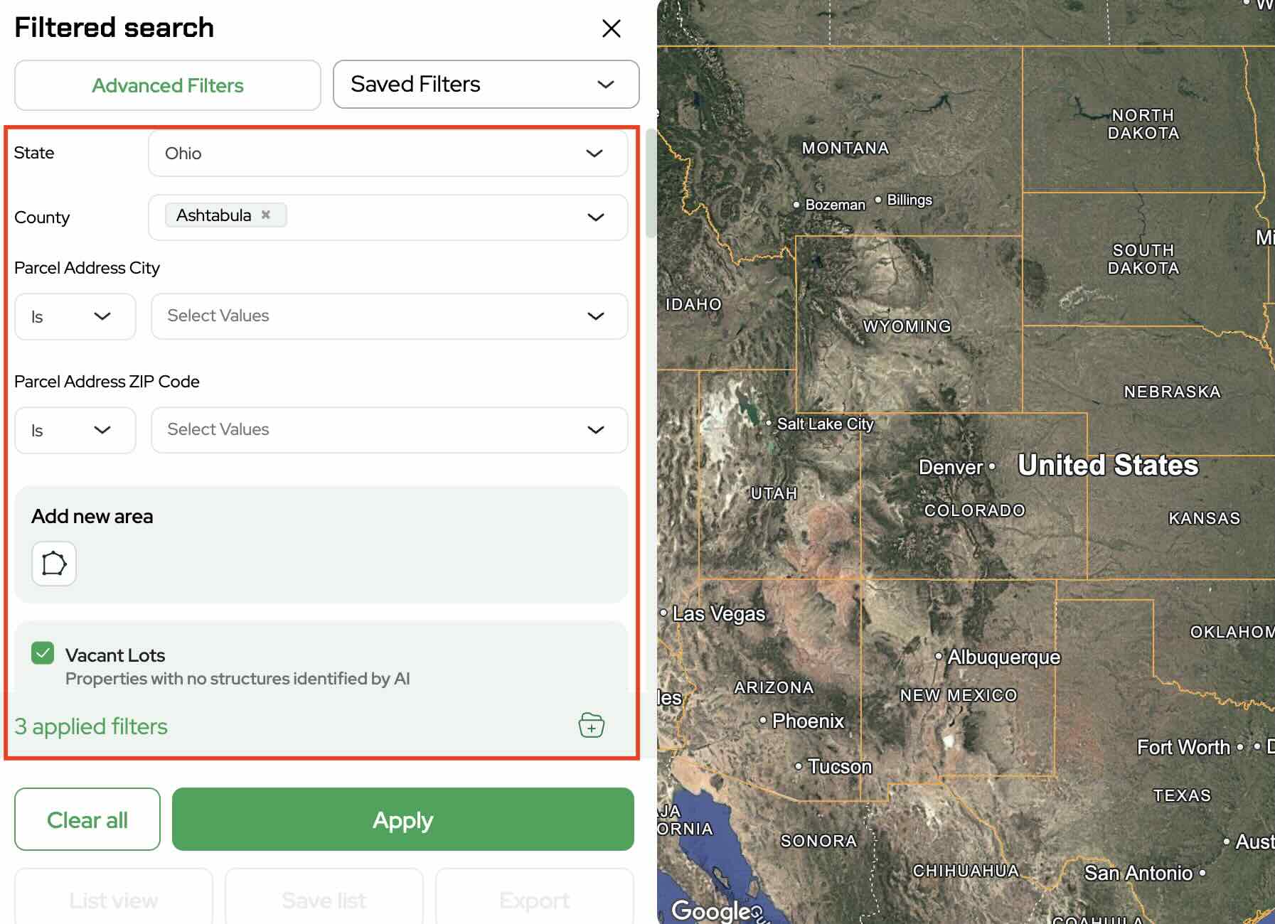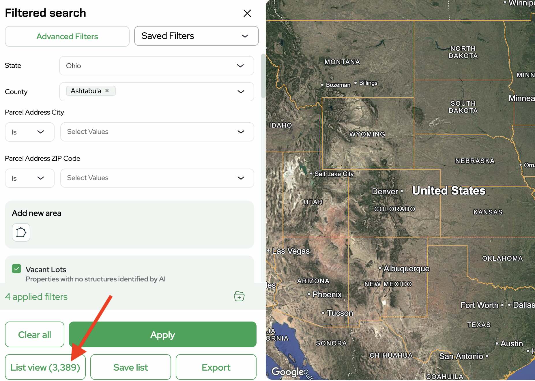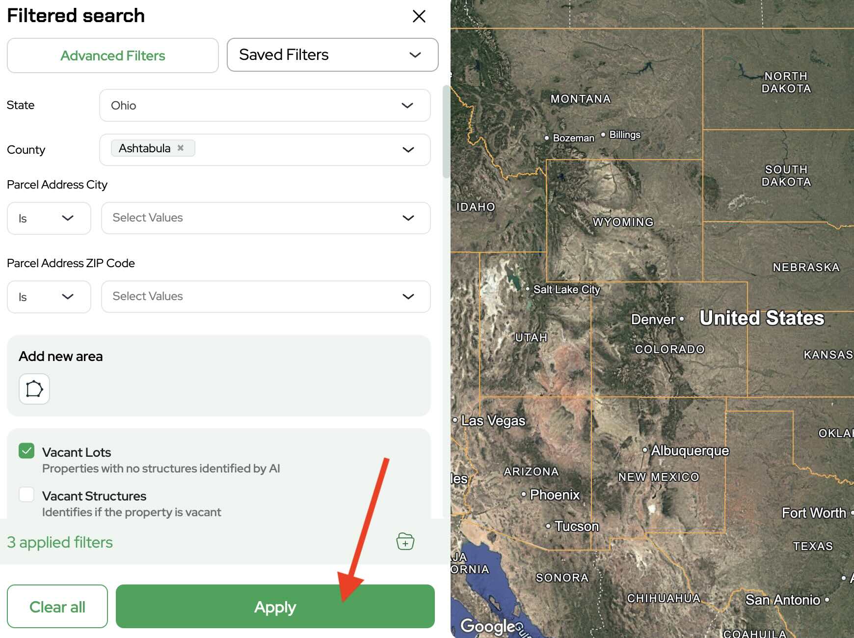 - Apply your filters such as state, county, vacant land, acreage, and any additional criteria