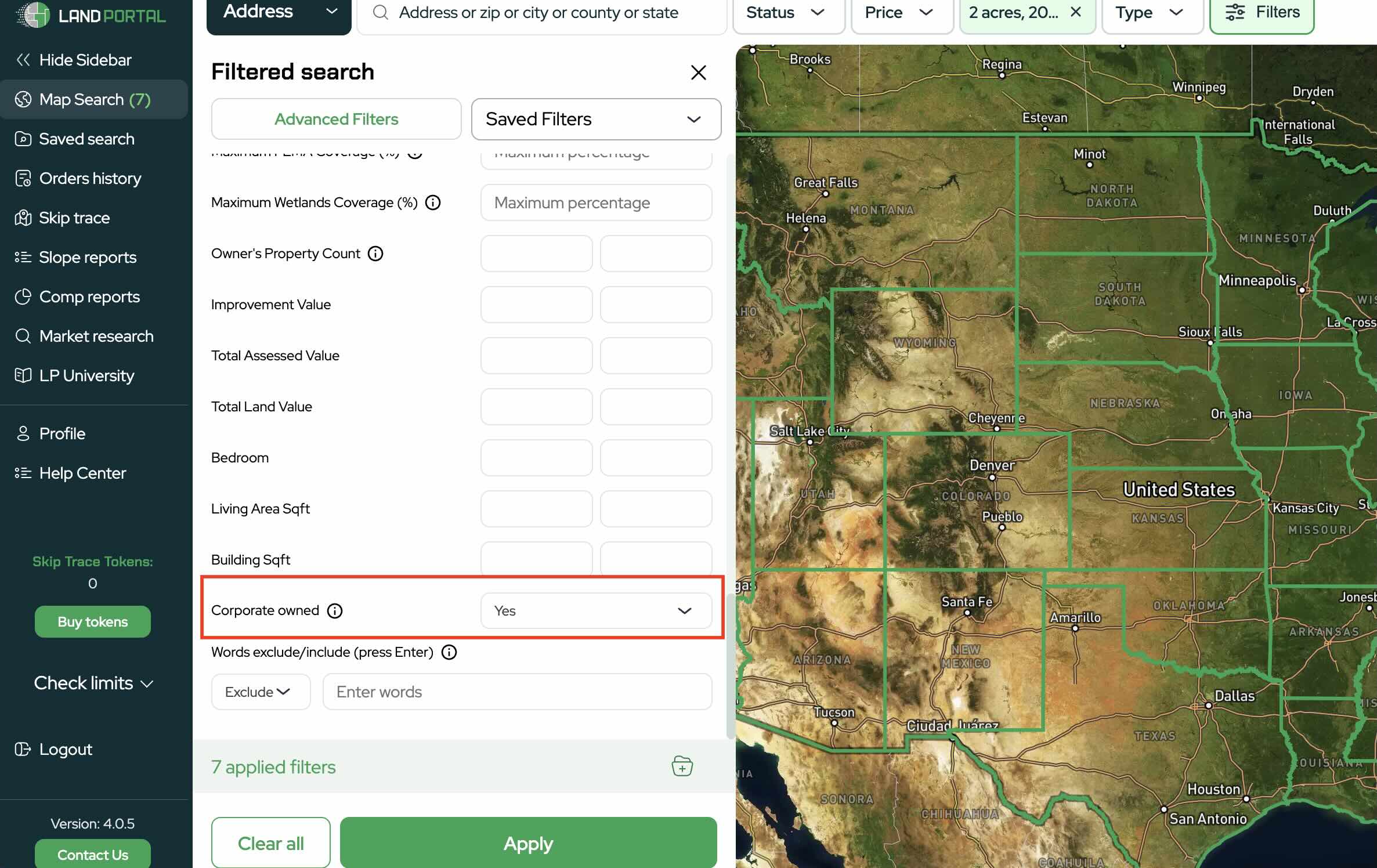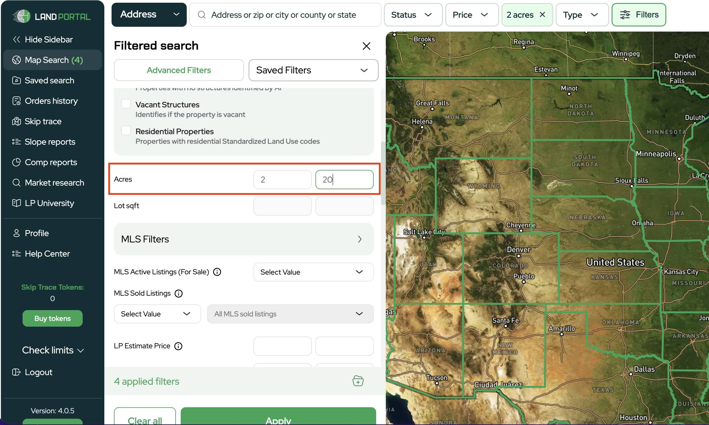 Set Acreage to 2–20 acres (or your preferred range) to match the kind of parcels you sell.