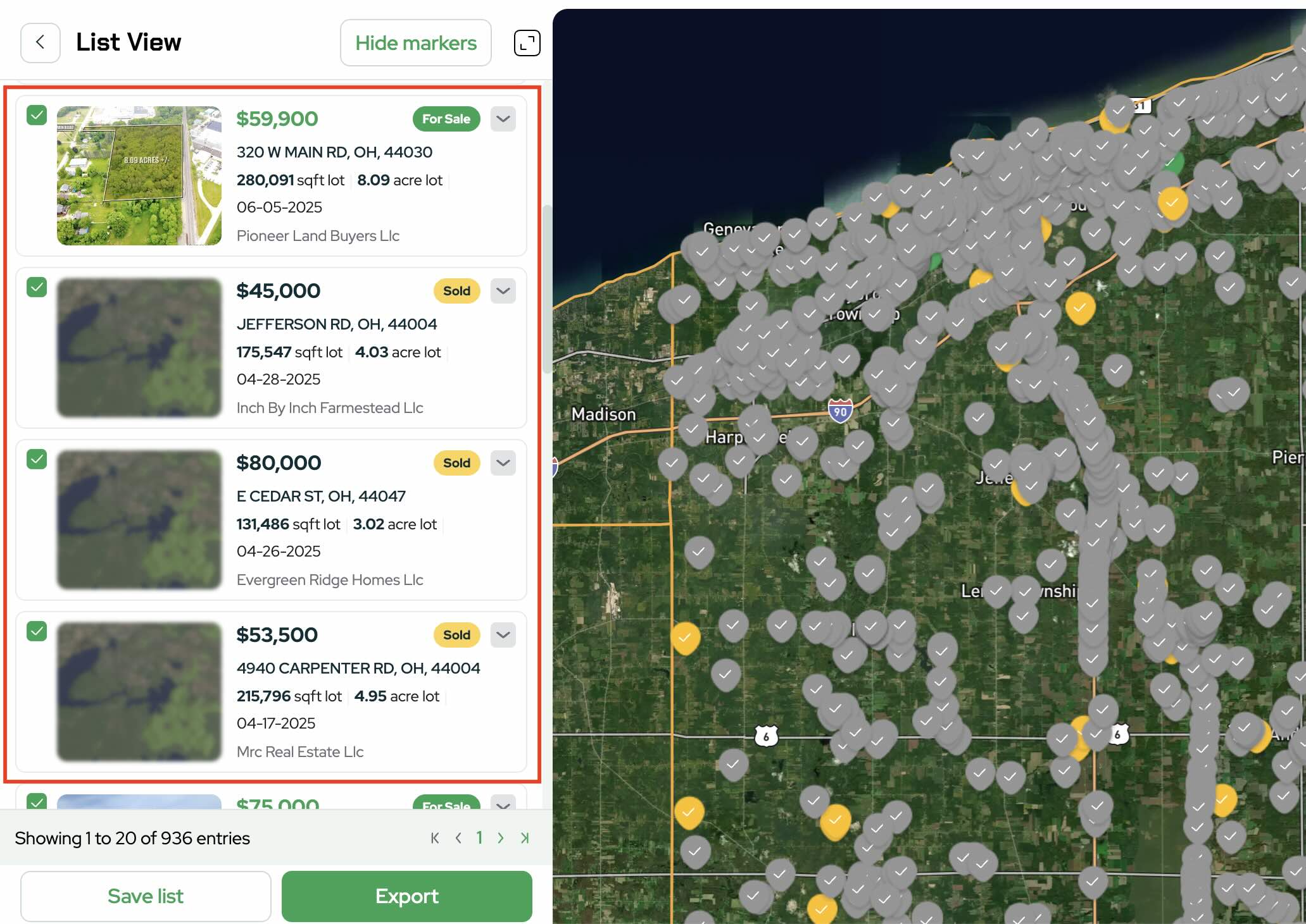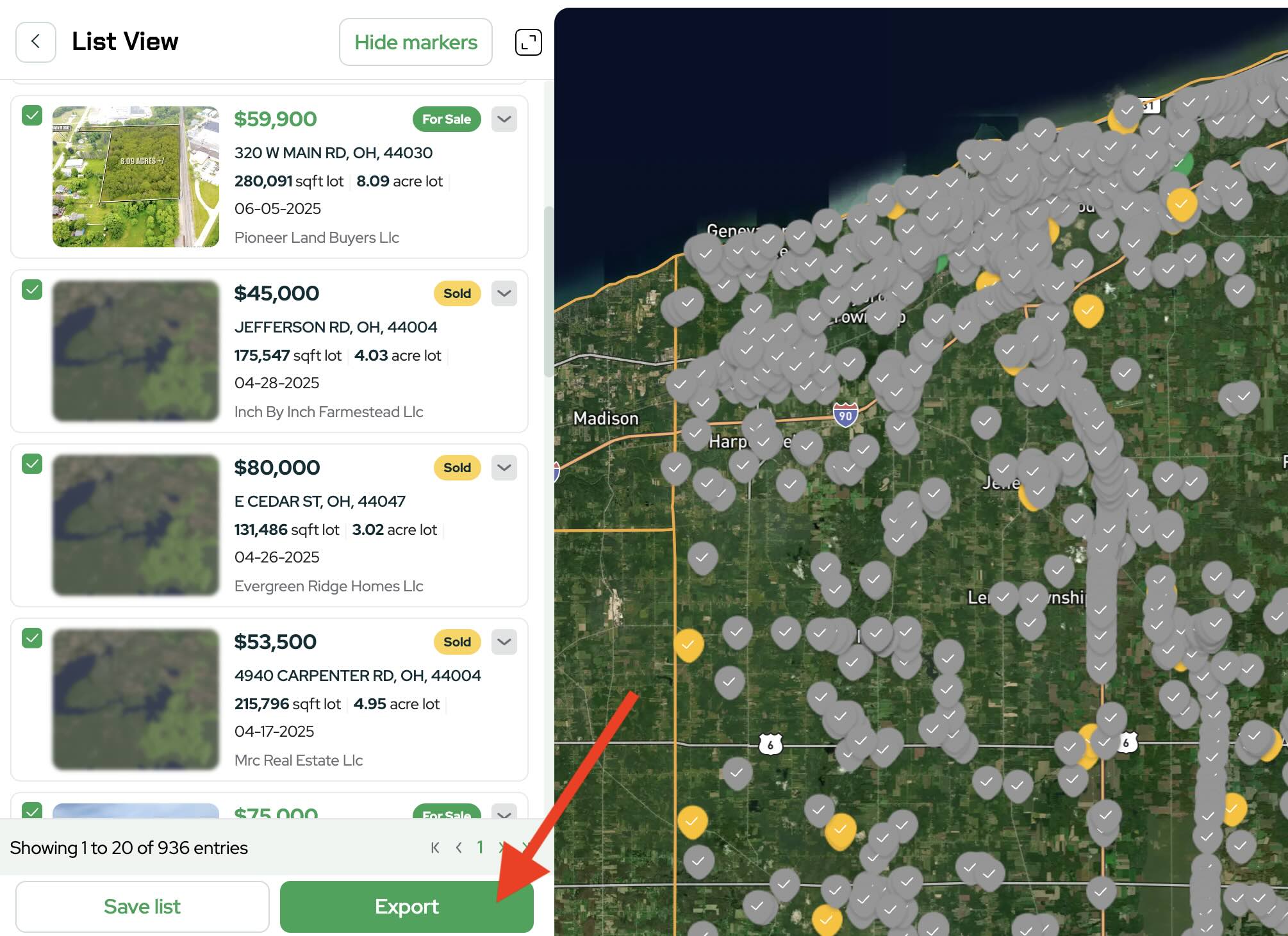 Land Portal’s map and filters make it simple to surface those active buyers (especially corporate buyers like LLCs, builders, and developers) and export them into a clean outreach list.