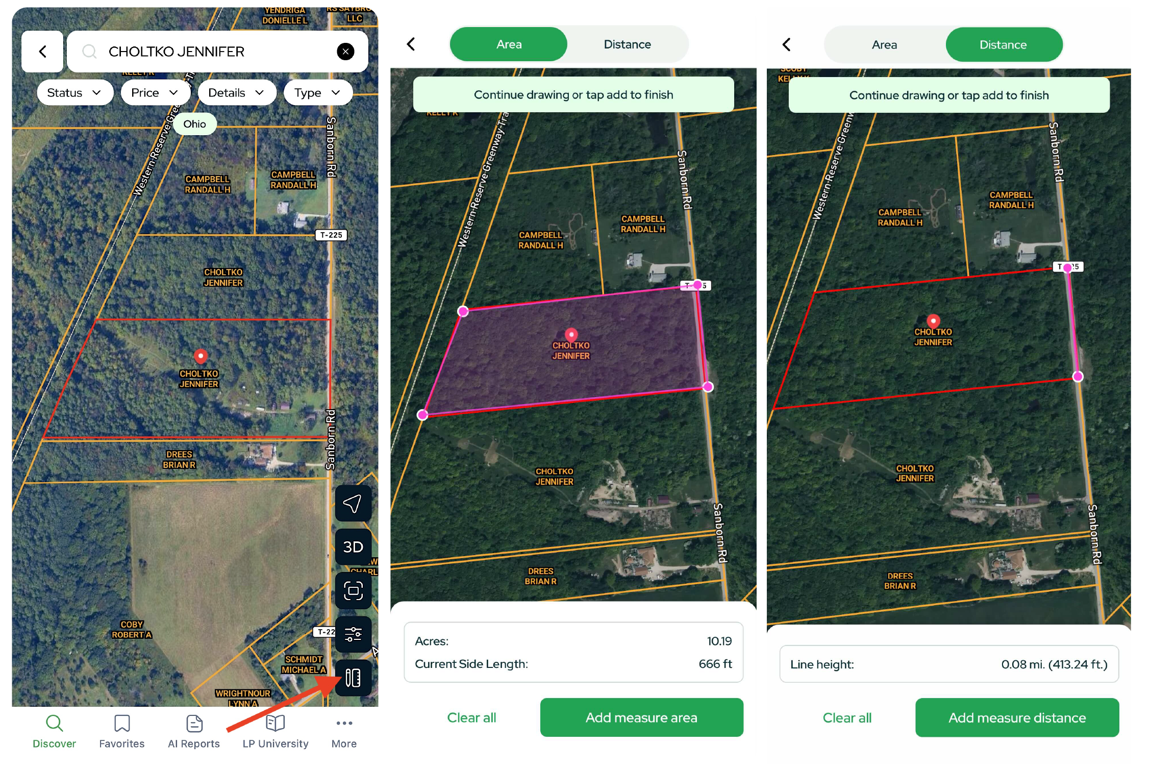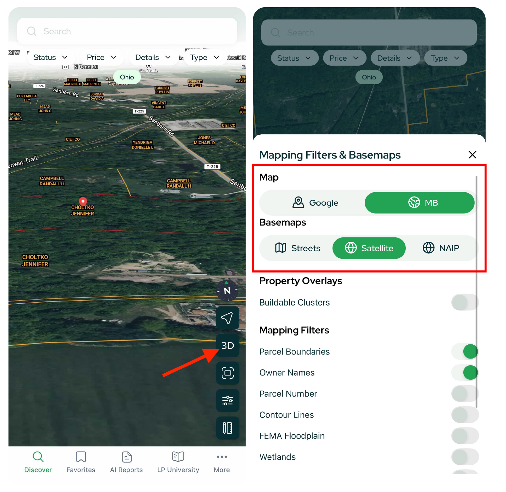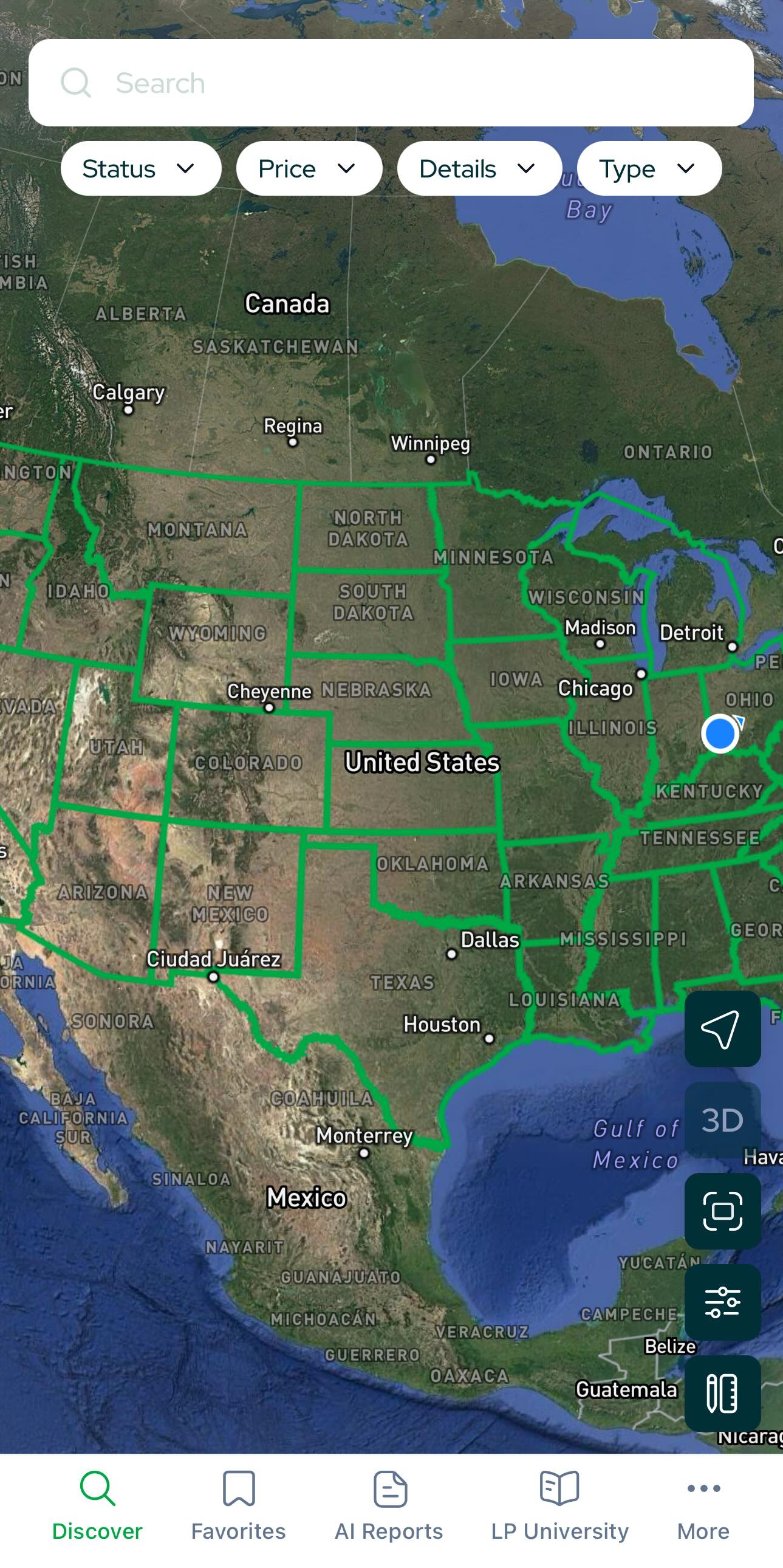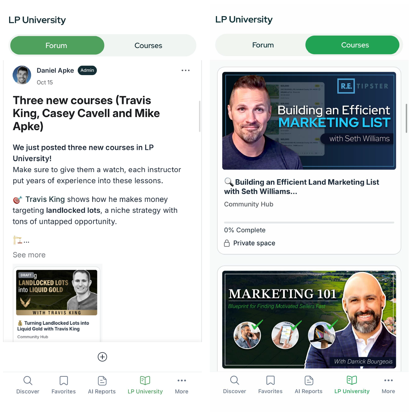 From a single map screen you can search, filter, analyze, and save properties; run AI-powered Comp and Slope Reports; jump into LP University; and manage your profile, all on mobile.