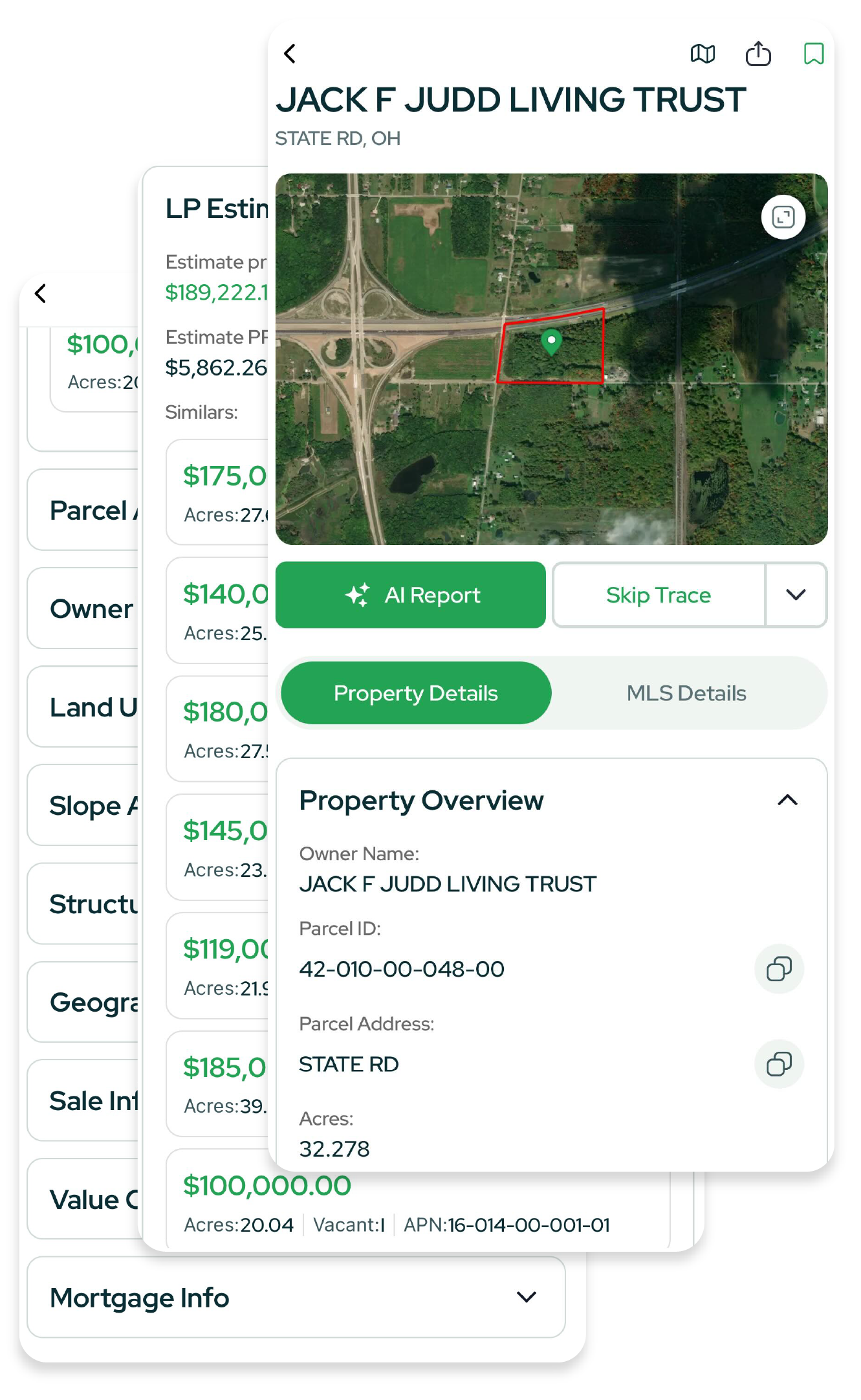 - Skip Trace → Call/Email: Move from analysis to outreach without leaving the Property Card.