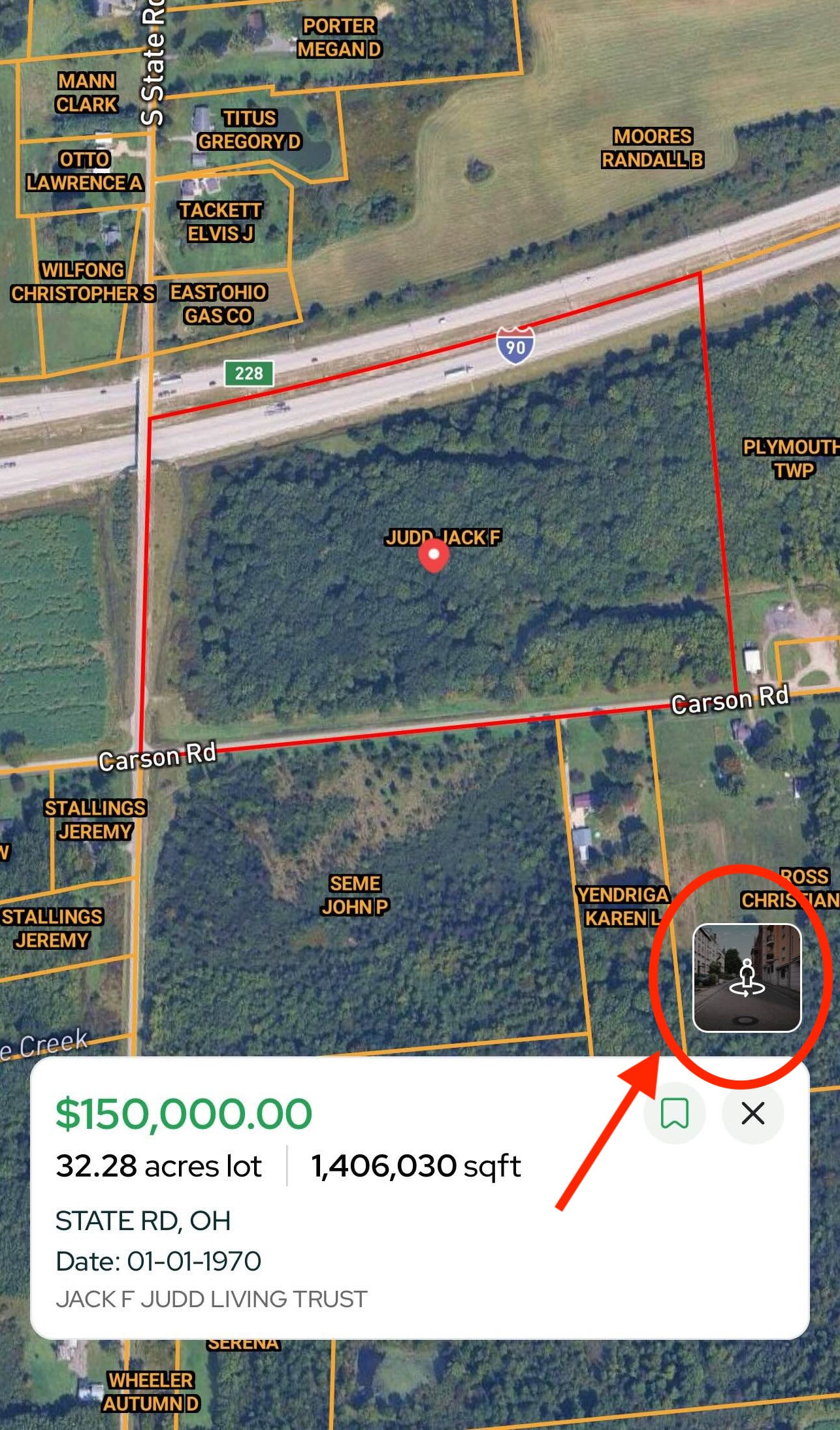 - Tap the Street View icon (person within two arrows) to launch Google Street View inside the app. Click around to scout the frontage, access, and surroundings without leaving Land Portal.