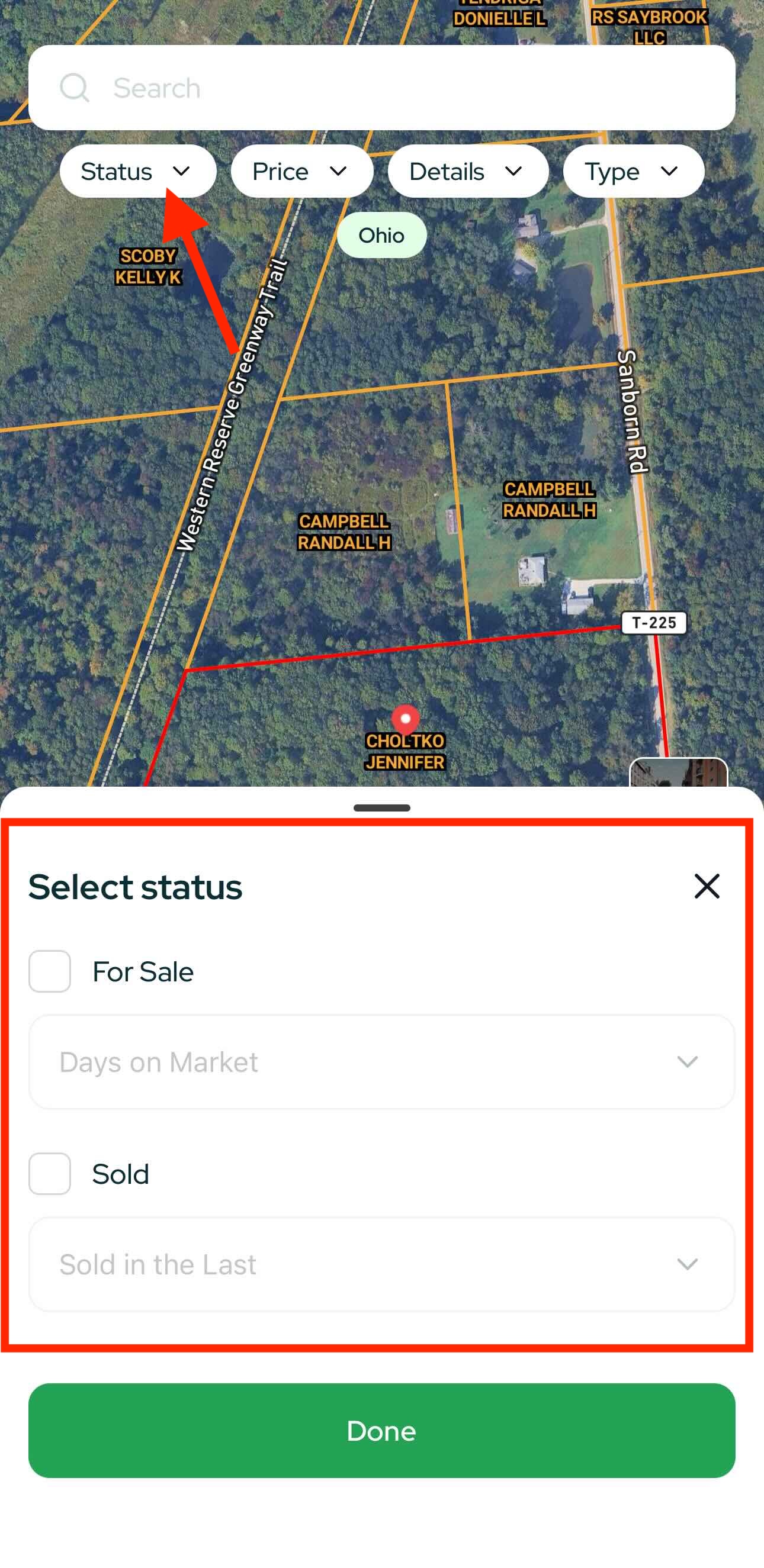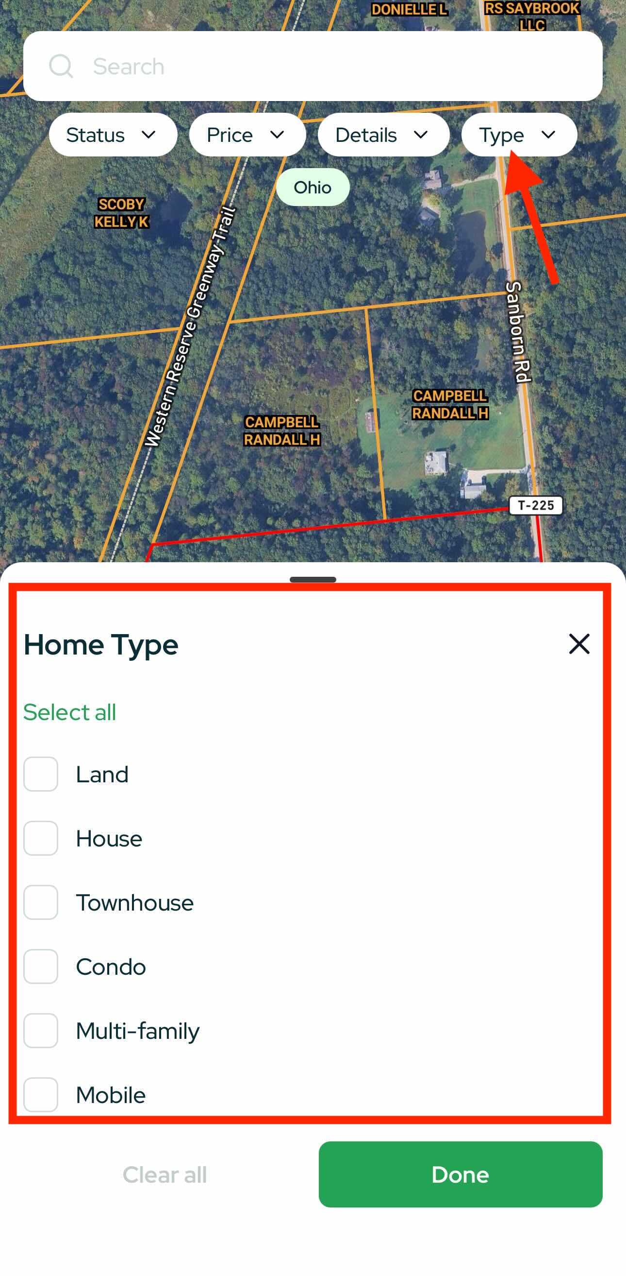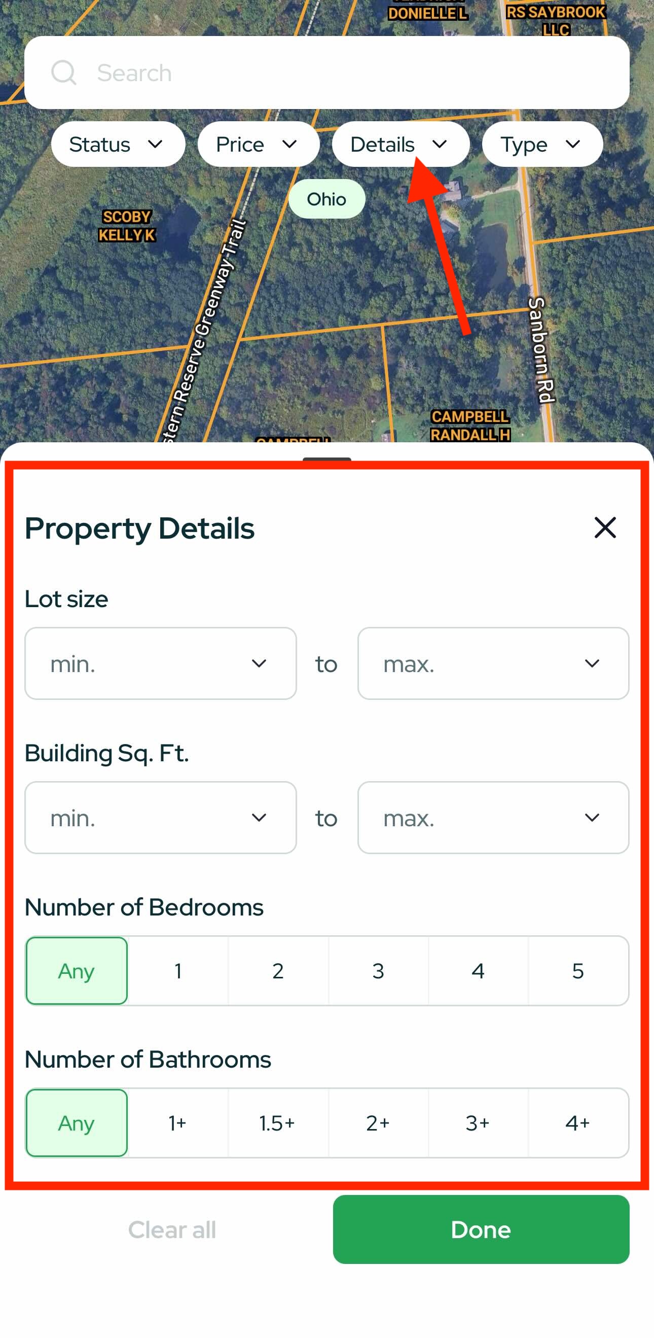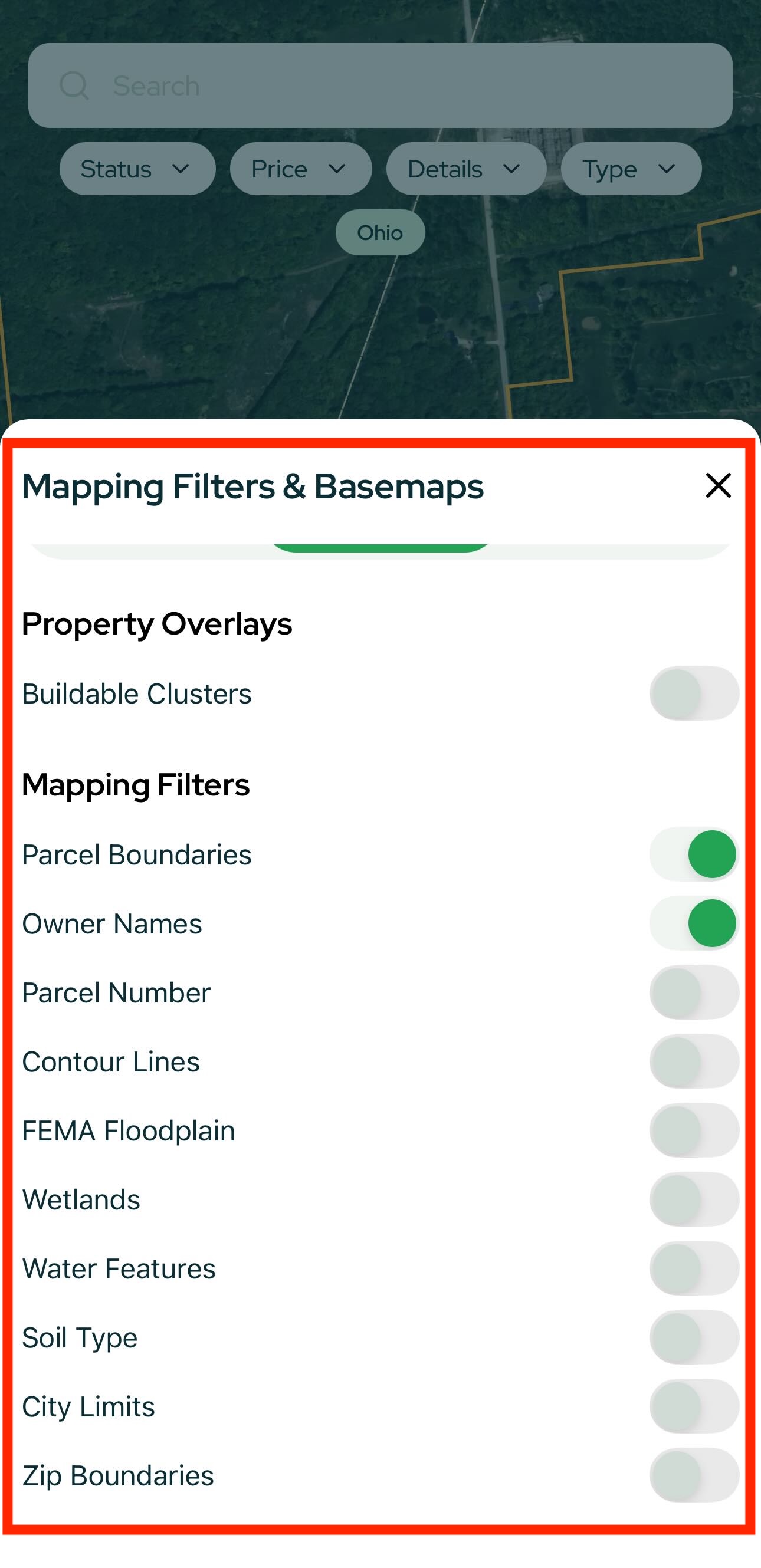 - Map in the center; pinch to zoom until properties appear
