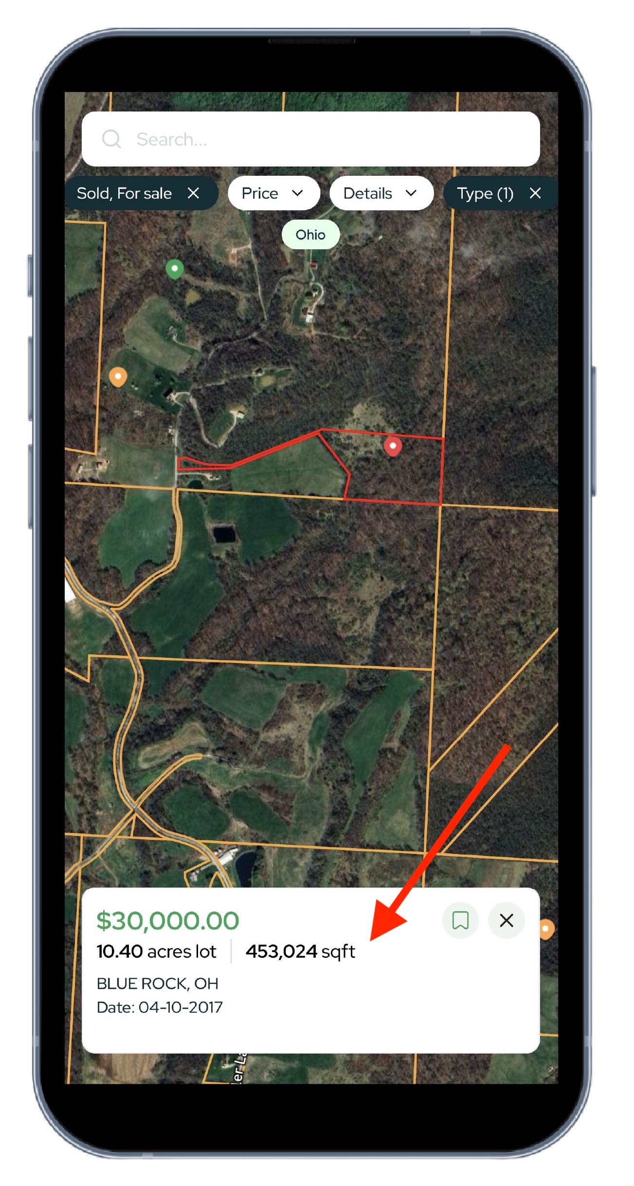 From the property card at the bottom of the screen, tap the parcel to open the full property details page.