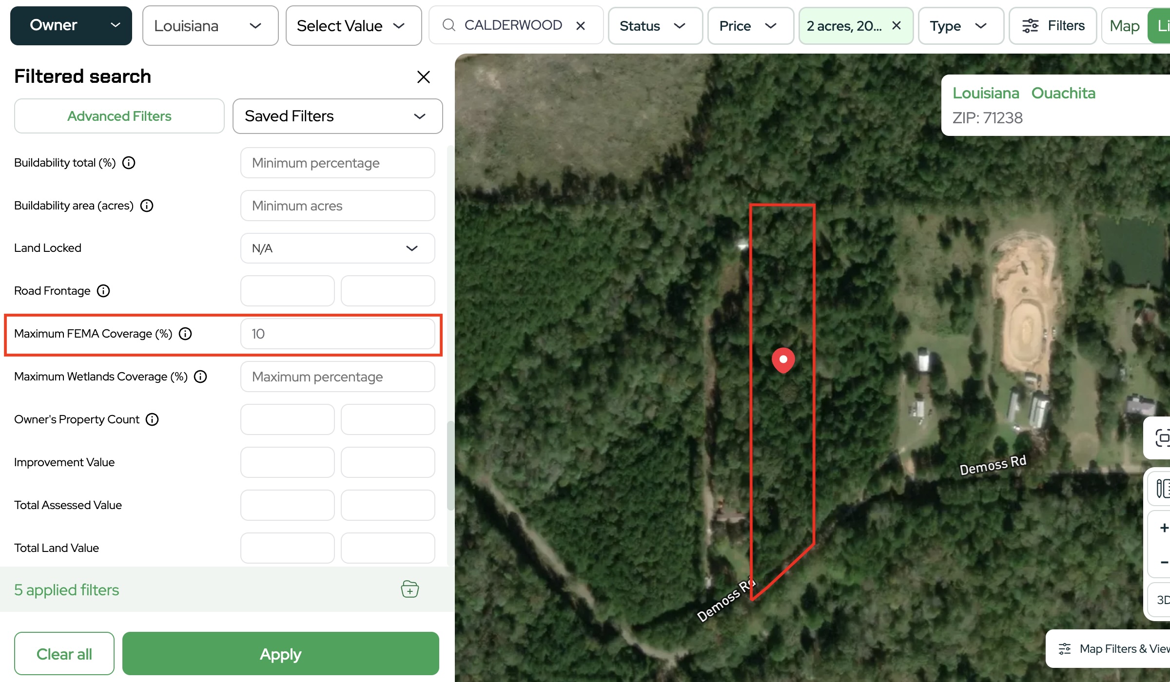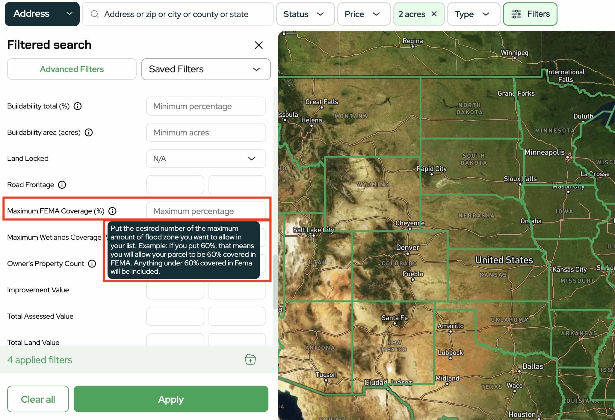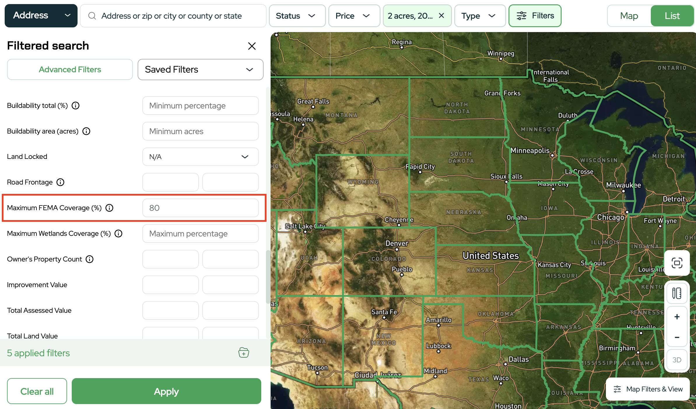 The FEMA Filter in Land Portal helps you quickly control for this risk by allowing you to filter properties based on how much of the parcel falls within FEMA flood zones.