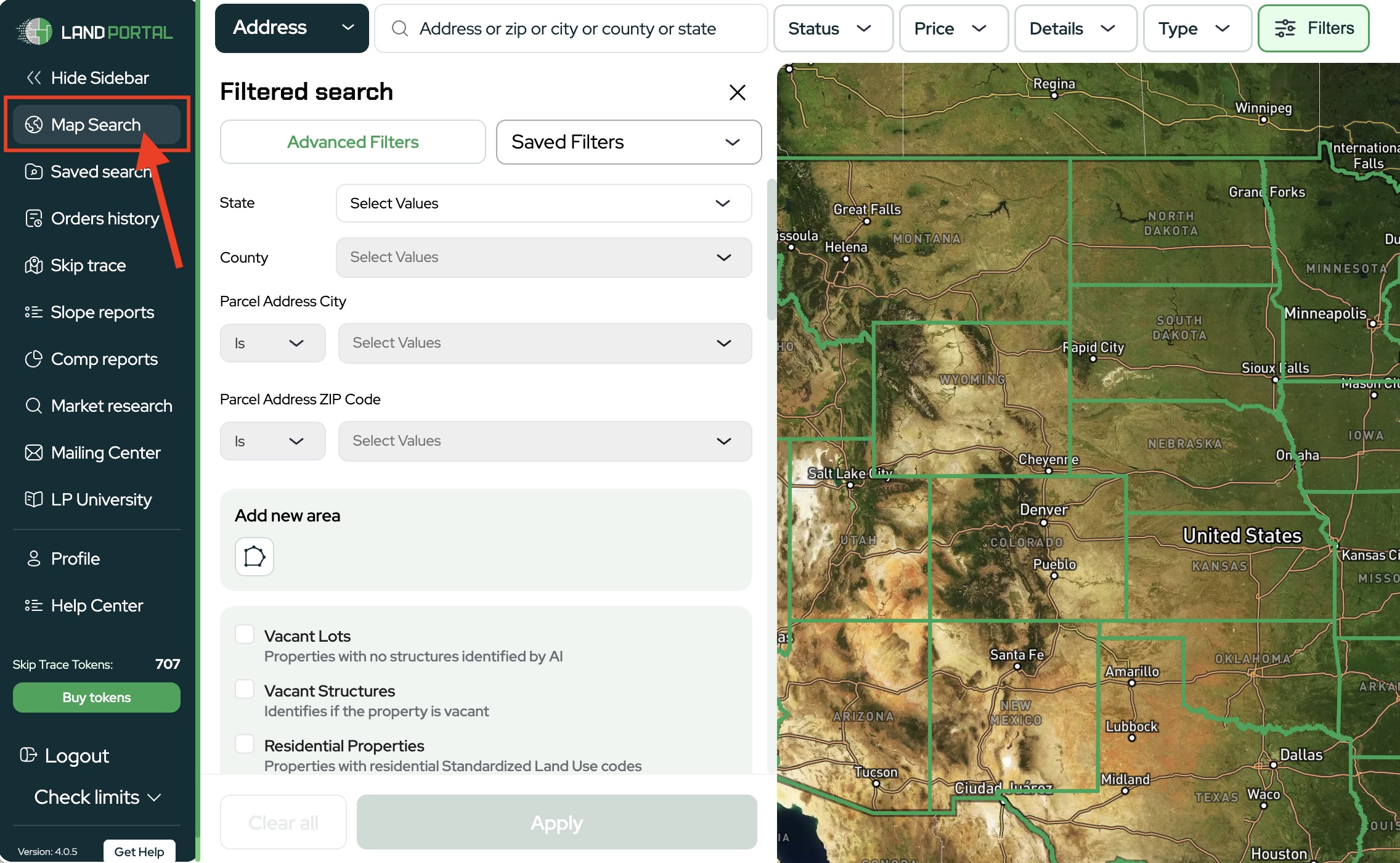 - Once logged in, open the Map Search to begin.