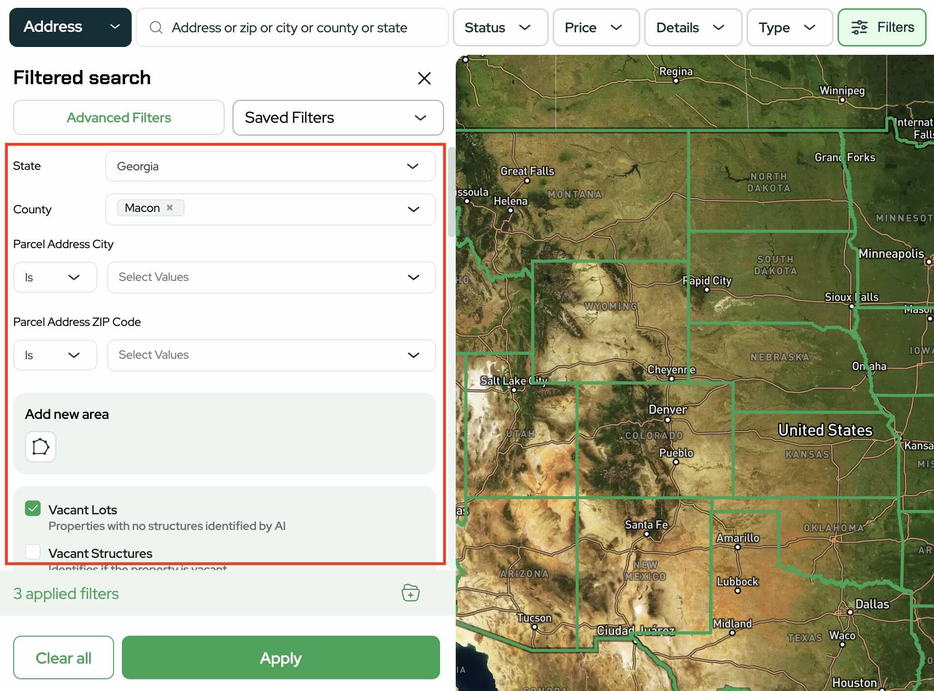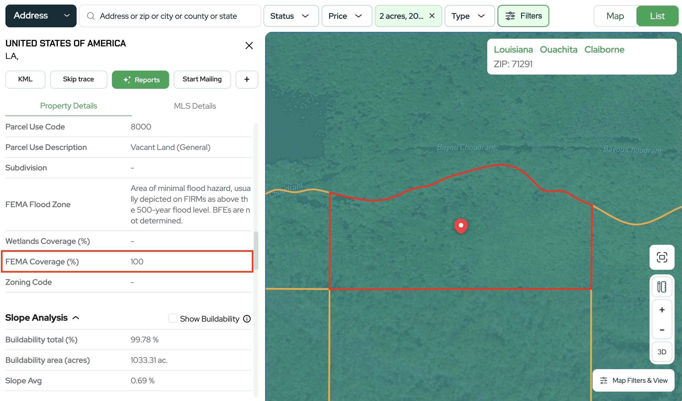 With this more restrictive setting, Land Portal removes any properties where more than 10% of the parcel is located within a FEMA flood zone.
