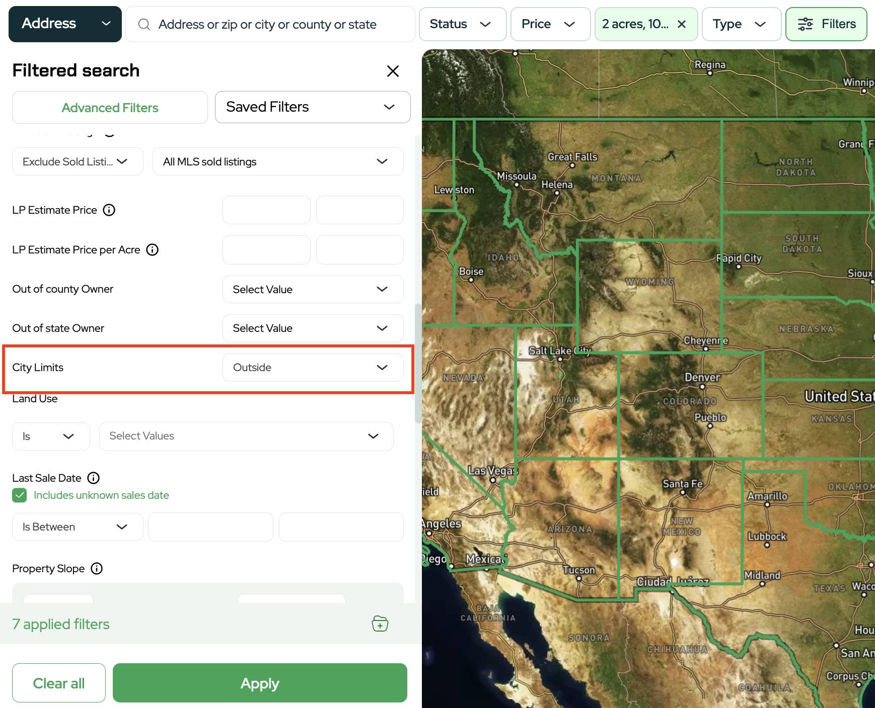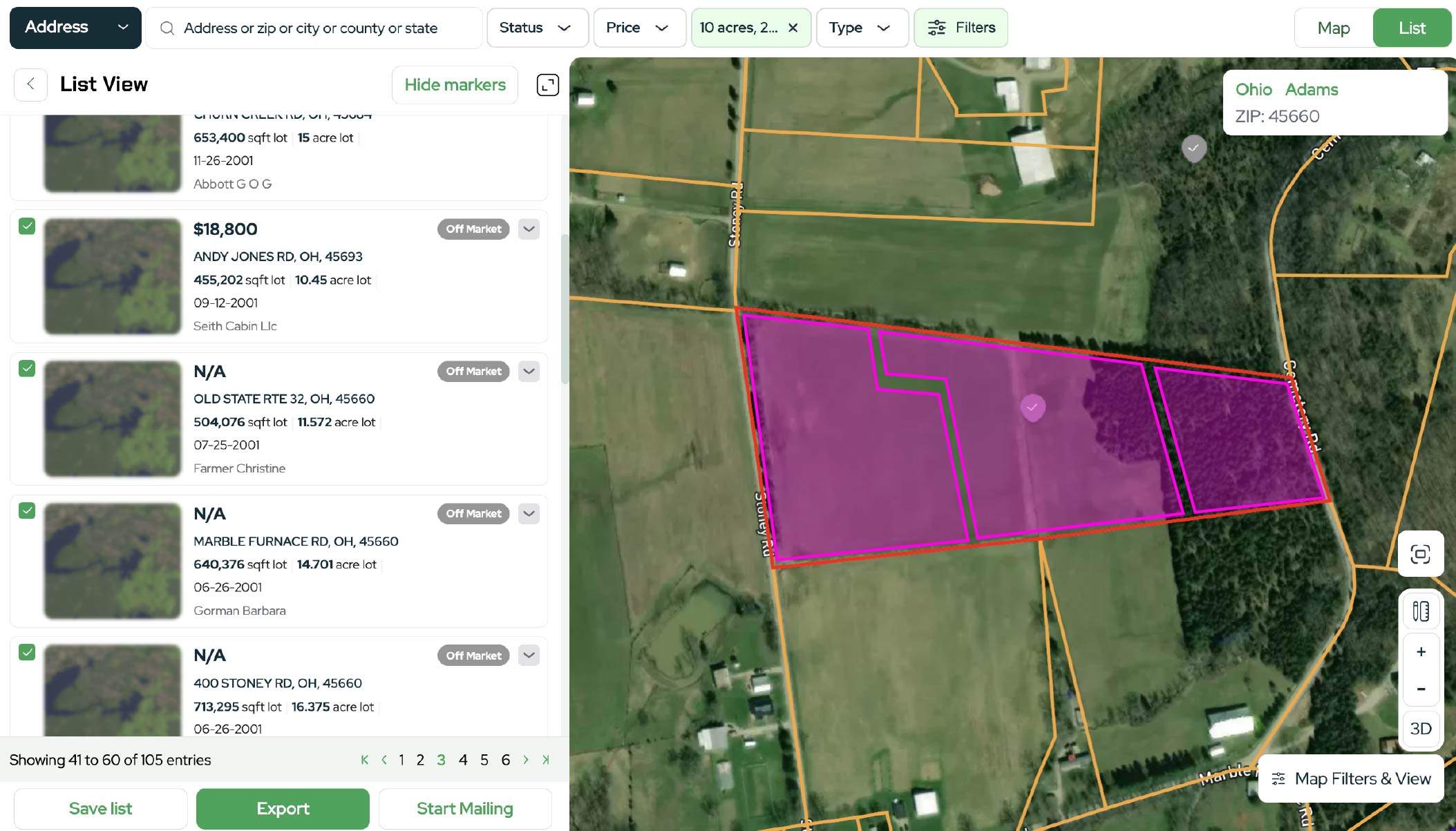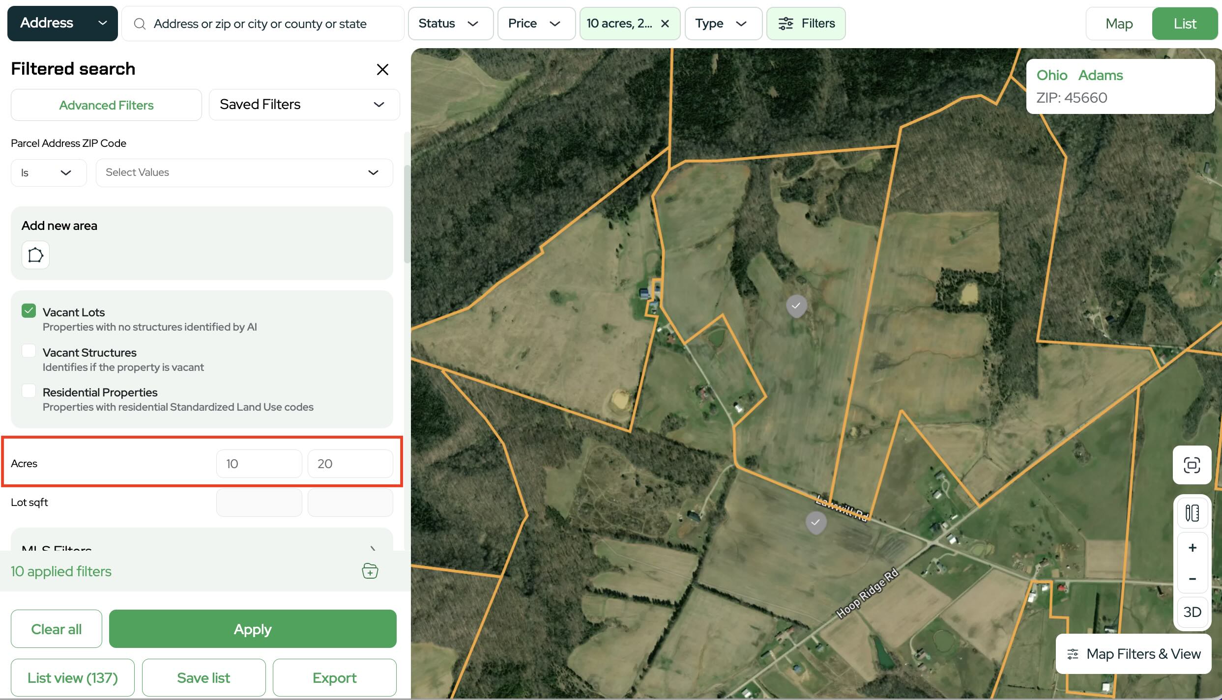 Login to Land Portal, head to the Map Search, apply your filters, and start building your subdivide list now.