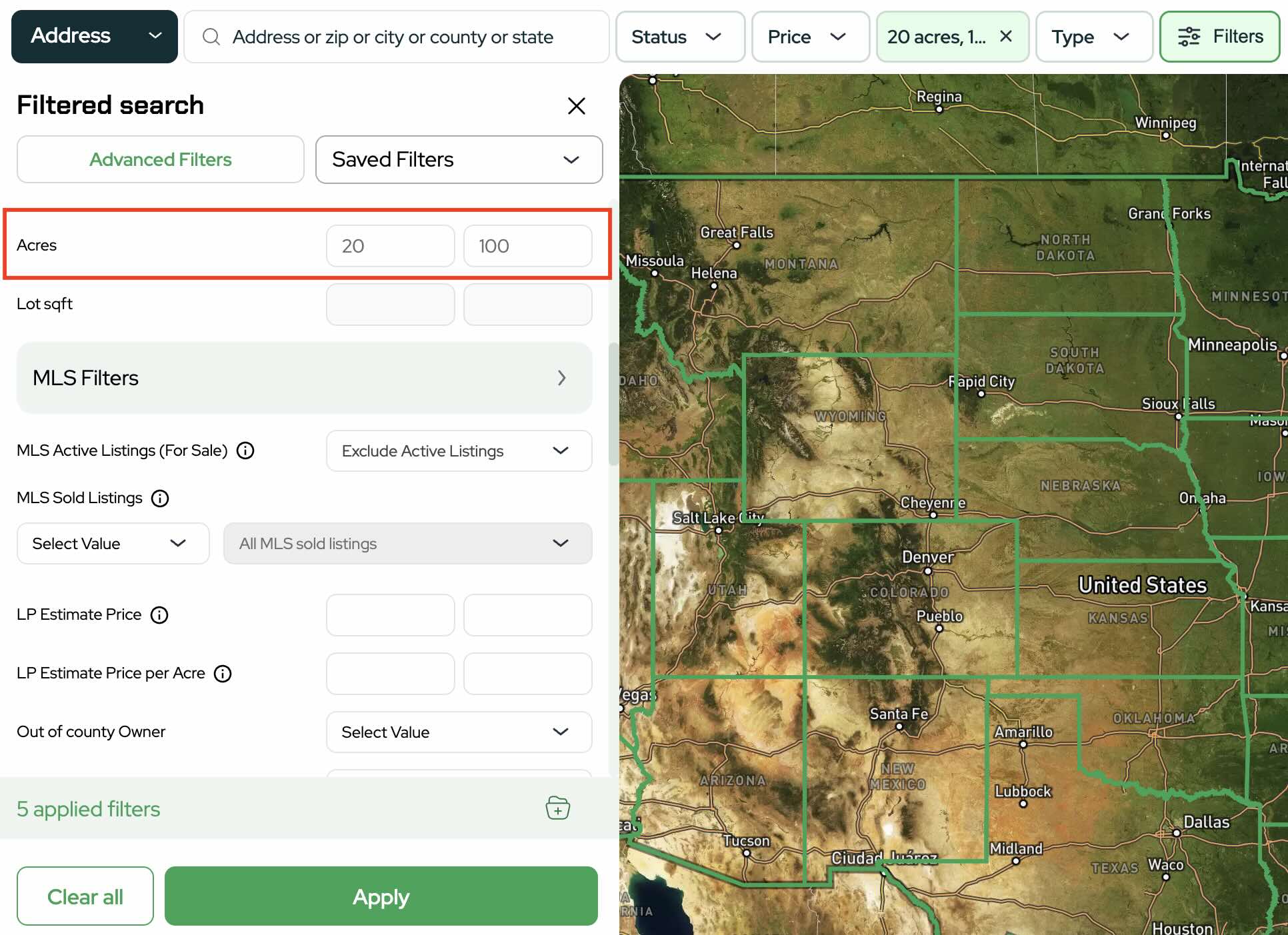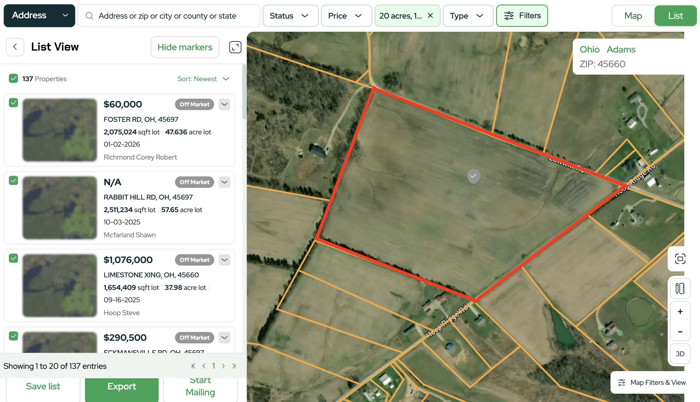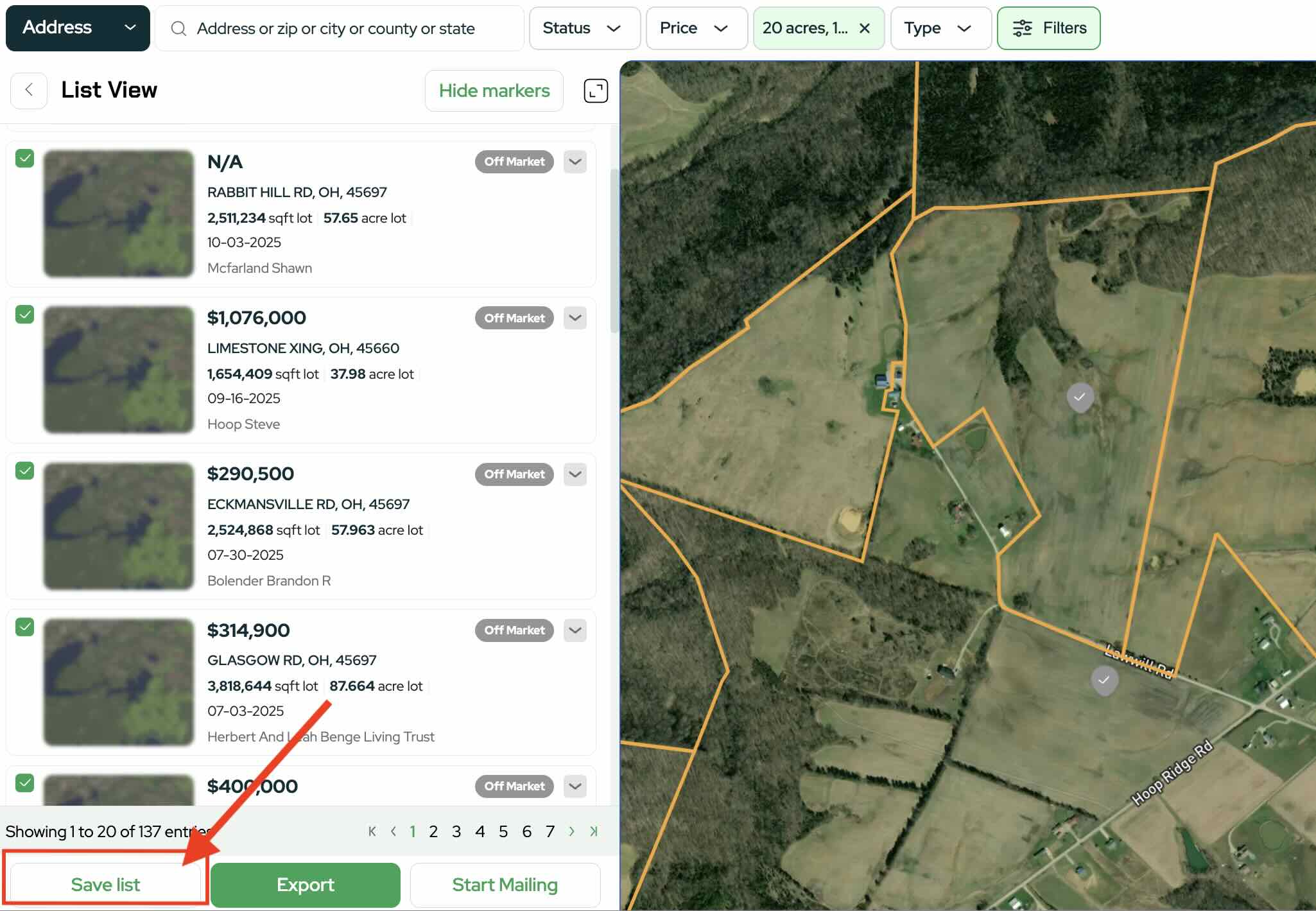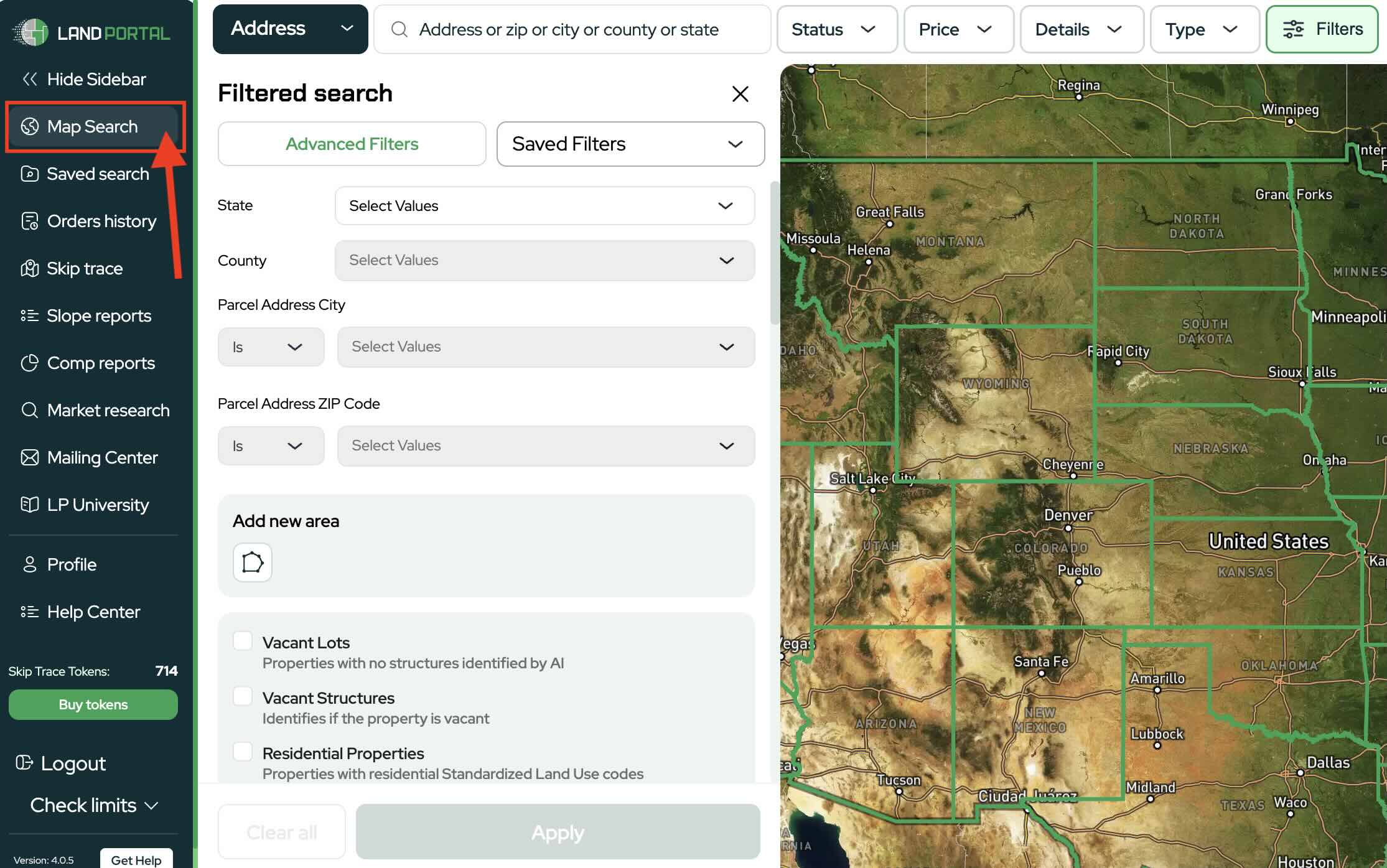 Login to Land Portal, head to the Map Search, apply your filters, and start building your subdivide list now.