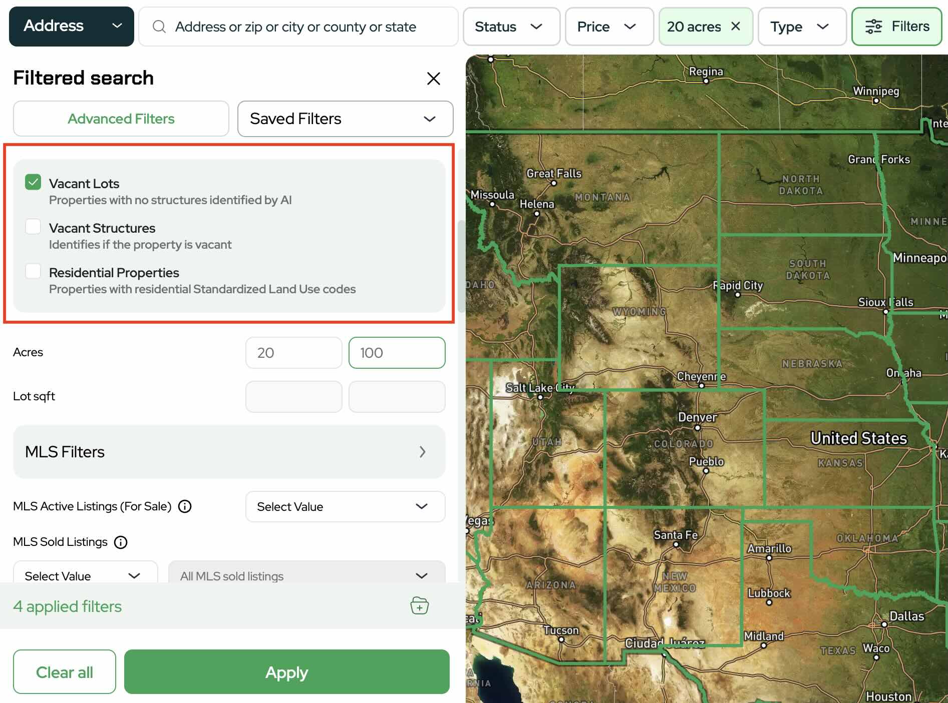 This uses AI and county data to remove properties with structures, ensuring you’re only targeting true vacant land suitable for subdivision.
