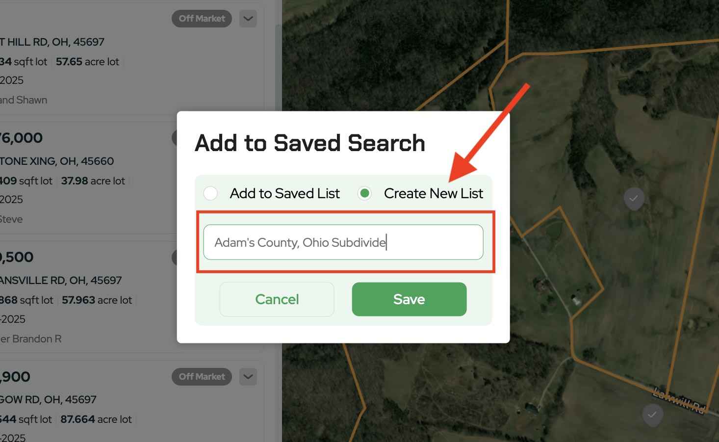 - Create New List & name your list (example: Adams County, Ohio Subdivide).