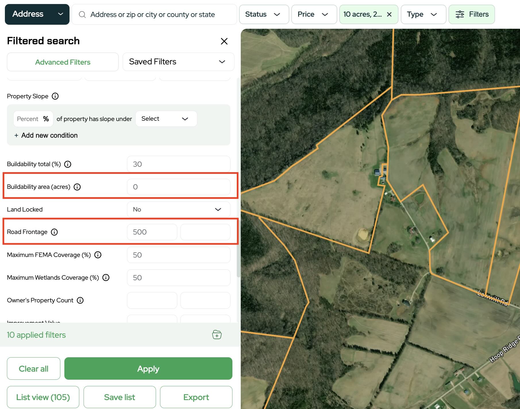 Land Portal makes this process simple by letting you stack highly specific filters, acreage, road frontage, buildability, FEMA, wetlands, and more, to surface properties that actually make sense for subdividing.