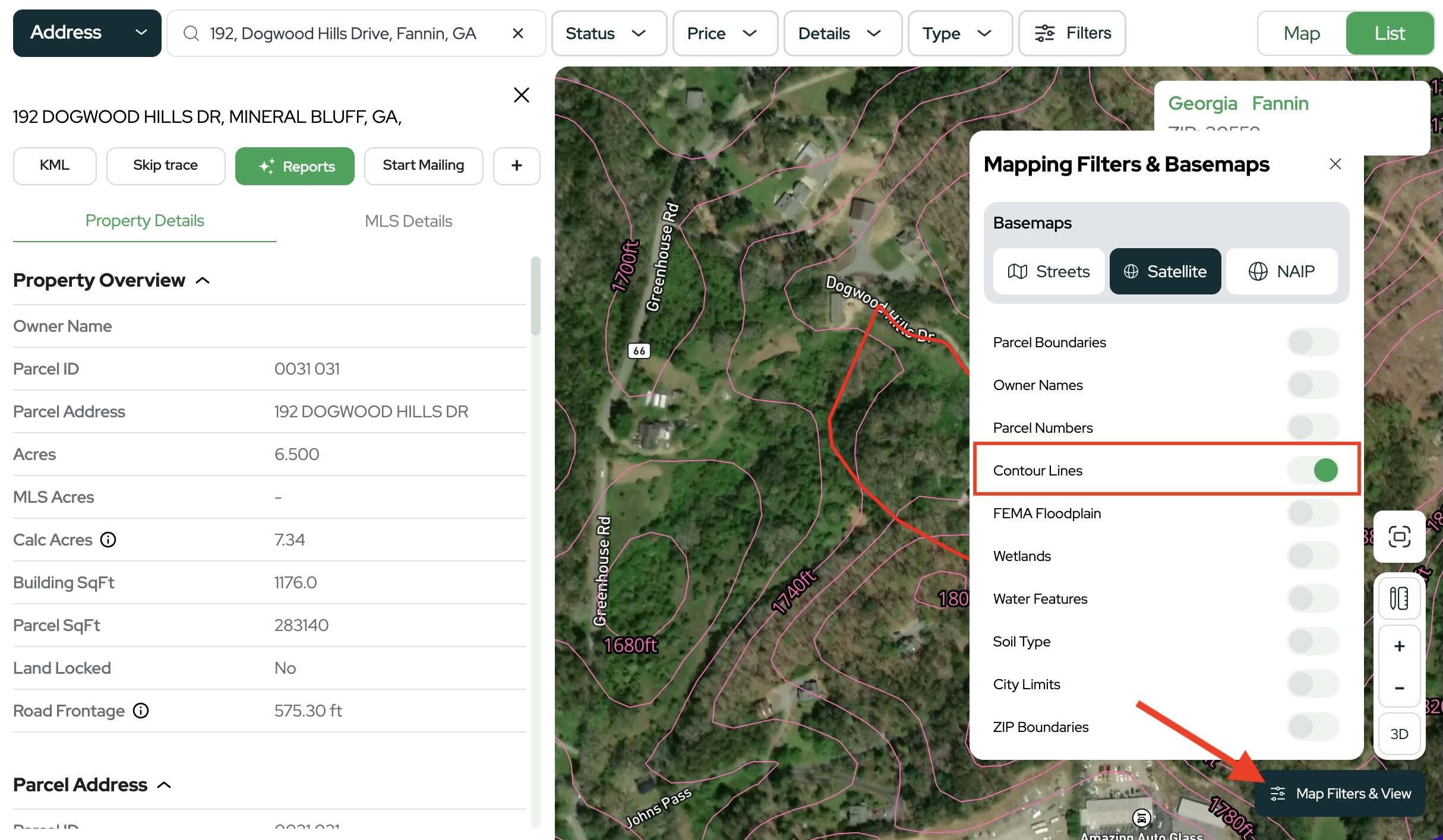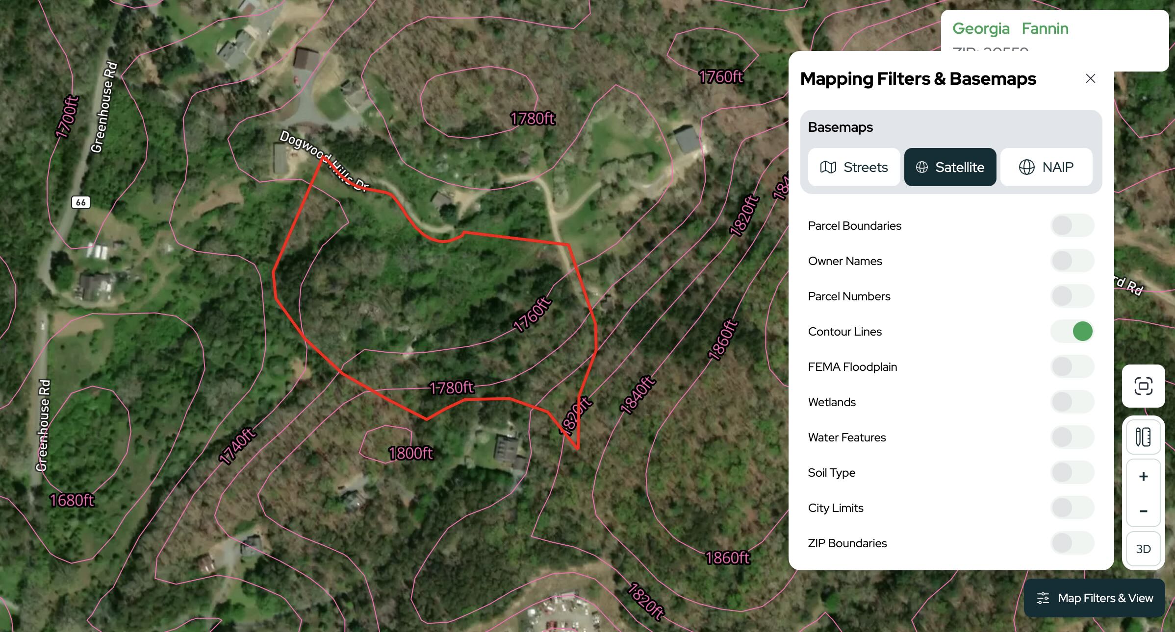 Turn on the Contour Lines map filter to display elevation markings across the parcel.