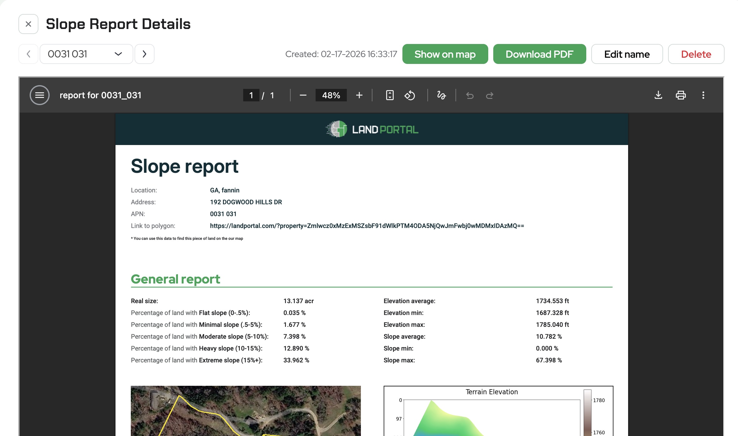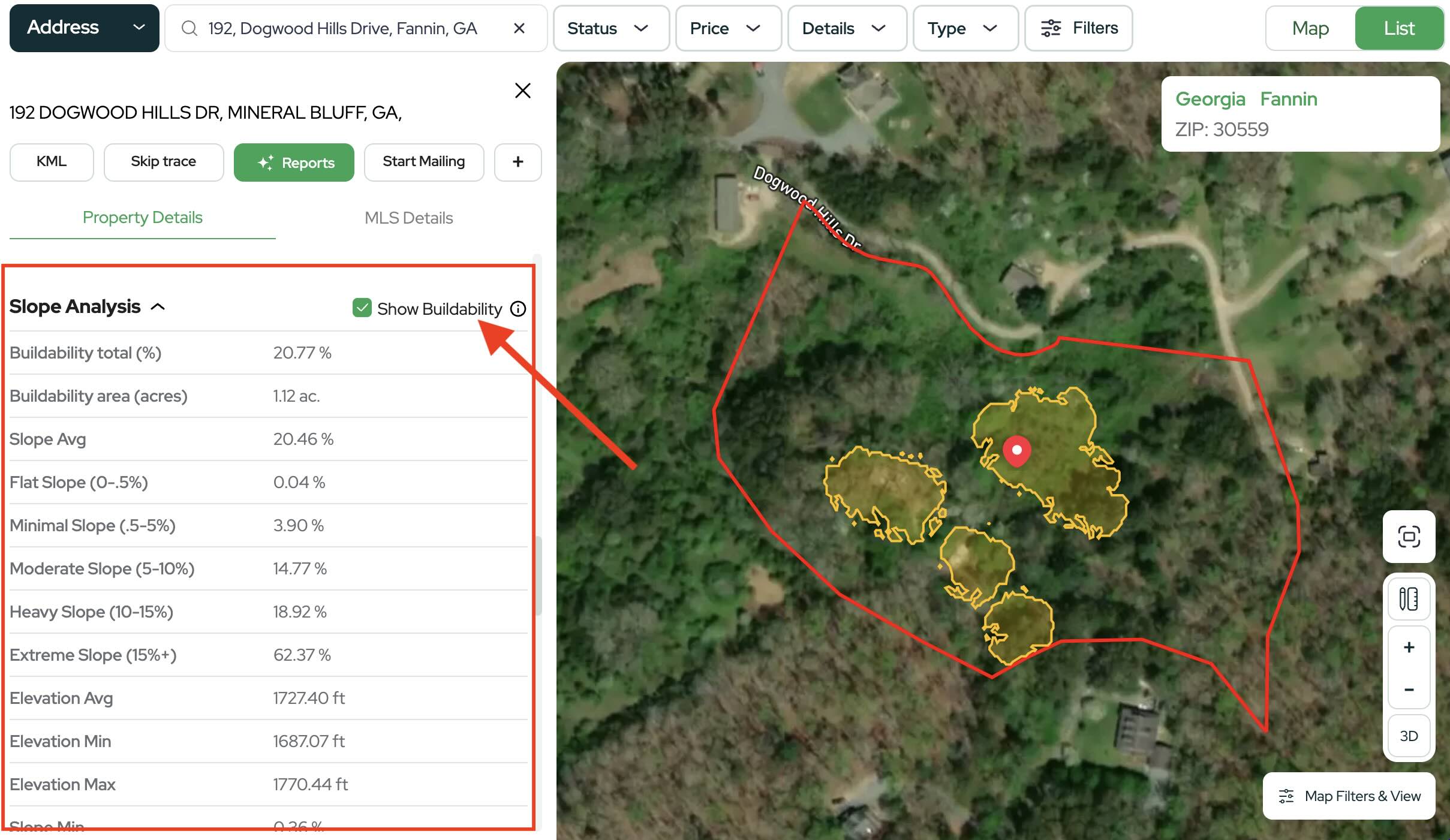 Here you will see estimated buildable acreage, buildable percentage, average slope, and a breakdown of slope grades.