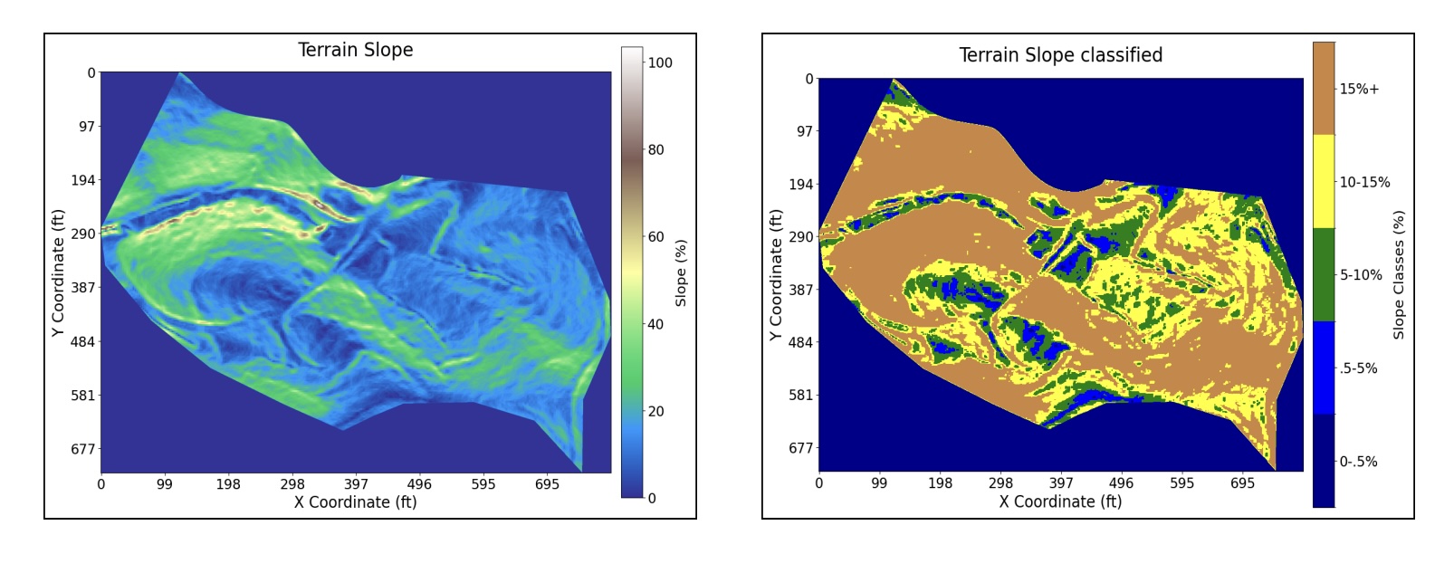 Color-coded maps showing slope intensity and grouped slope percentages, helping you visually identify flatter areas versus steep terrain.