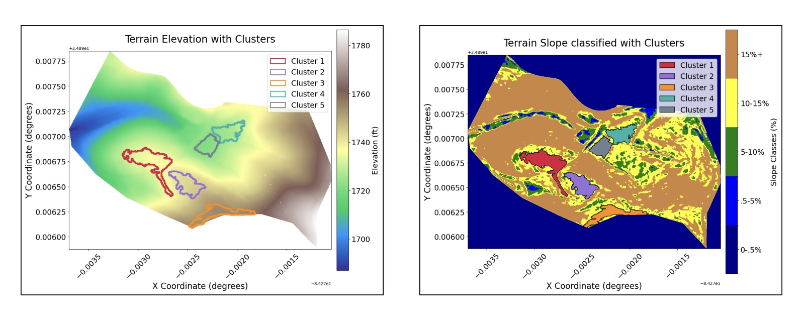 The report includes terrain elevation heat maps, slope classification overlays, individual cluster breakdowns, acreage per cluster, and percentage of flat area within each cluster.