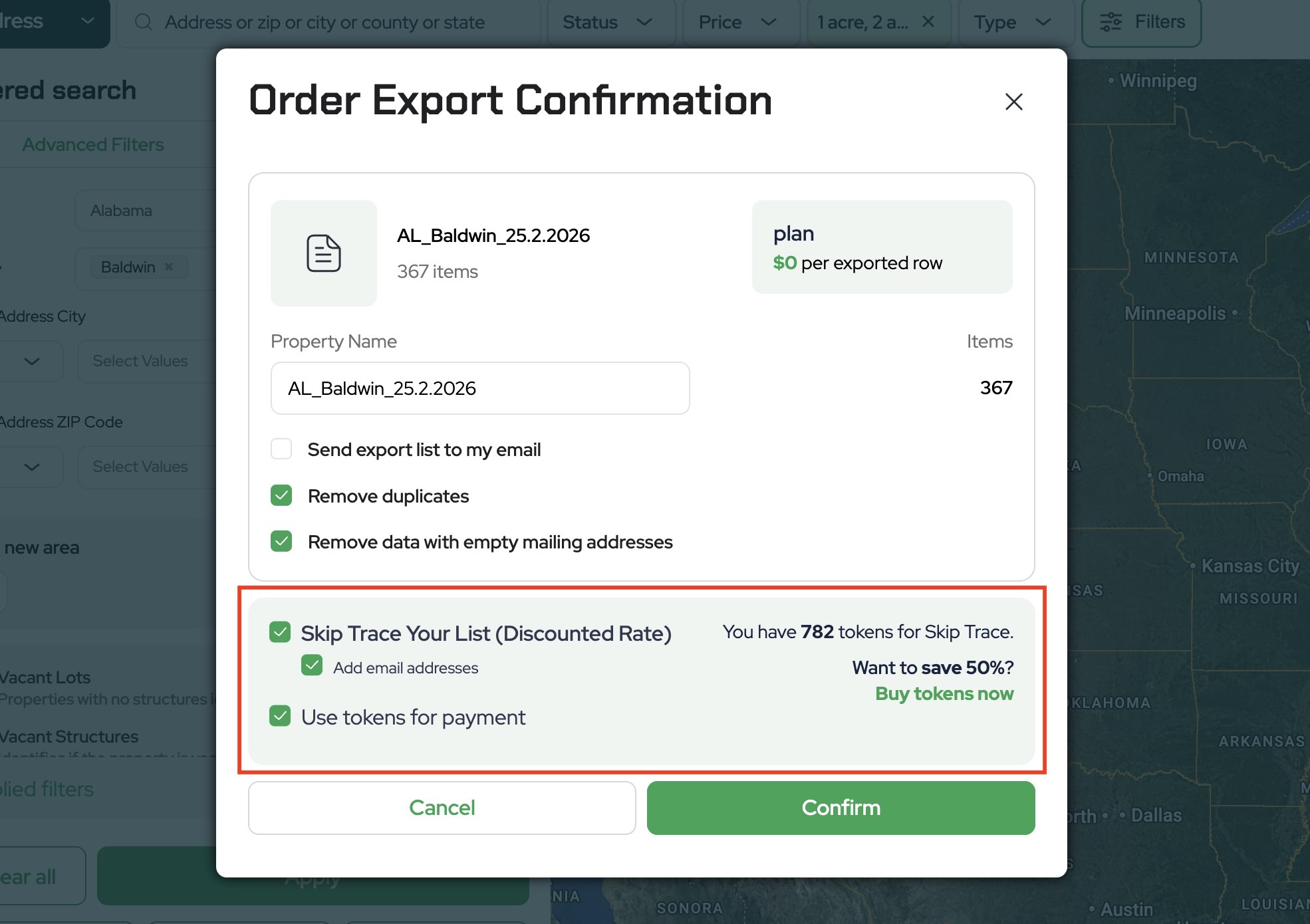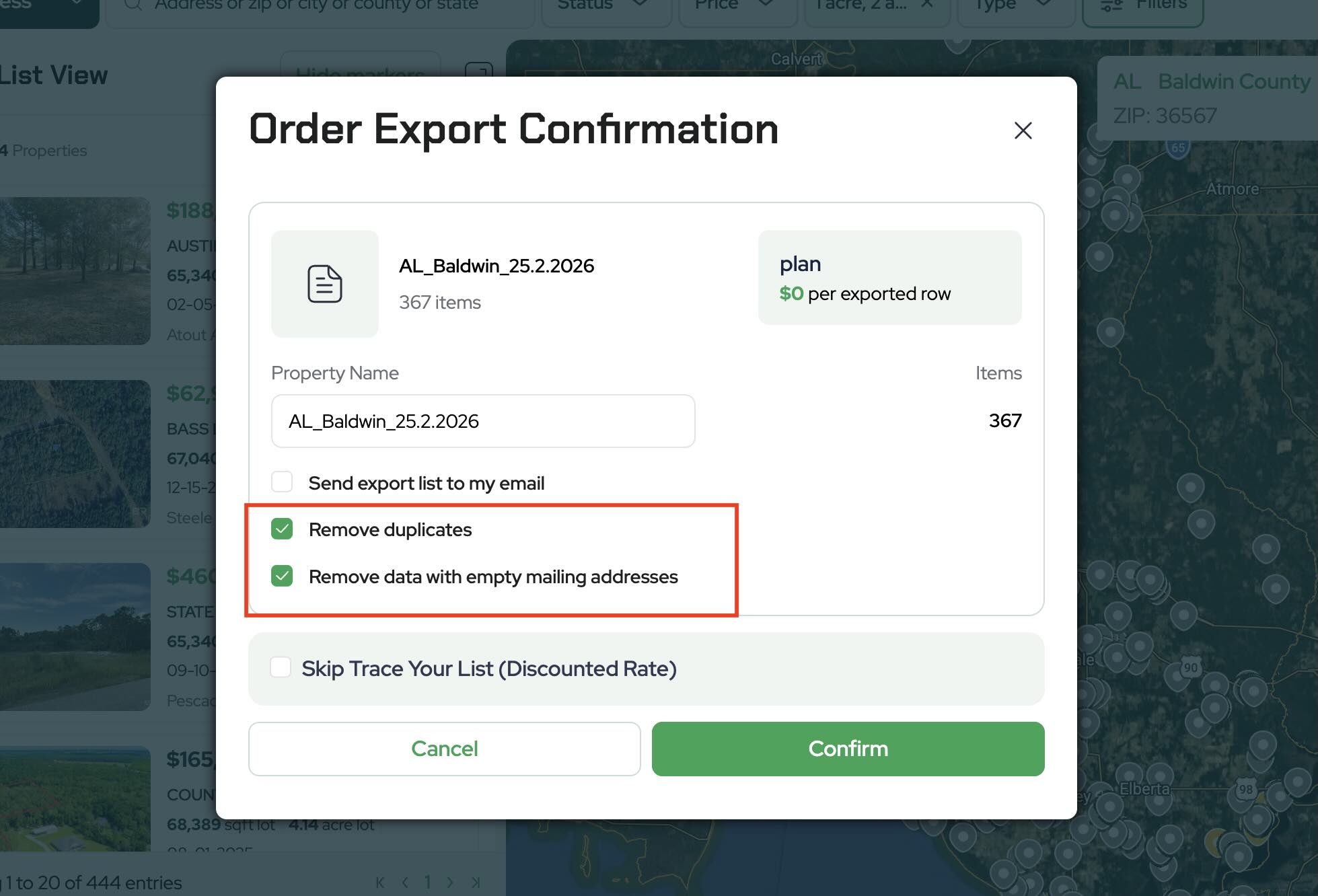 If you want to move faster, generate more conversations, and close more land deals, accurate contact information is essential. Land Portal makes it simple by allowing you to skip trace while exporting a new list or by uploading and enhancing your existing data inside the platform.