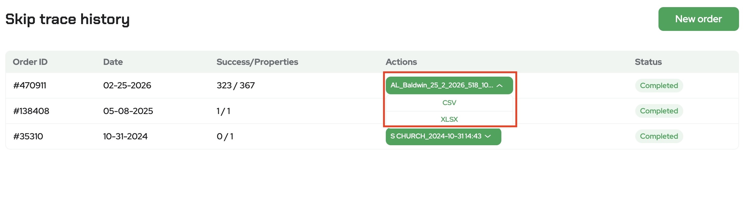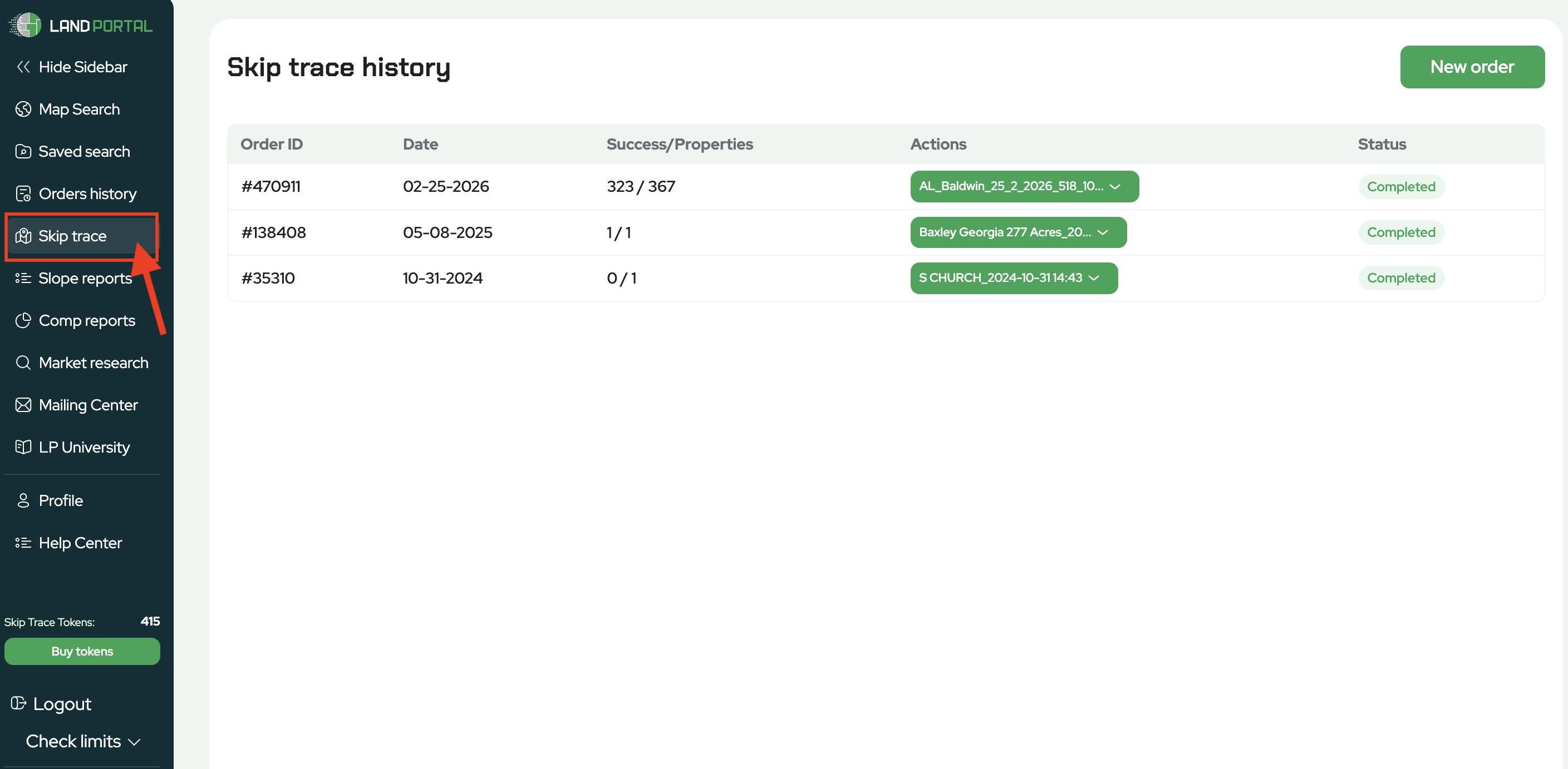 Go back to the Skip trace dashboard from the left-hand menu and start a New Order.