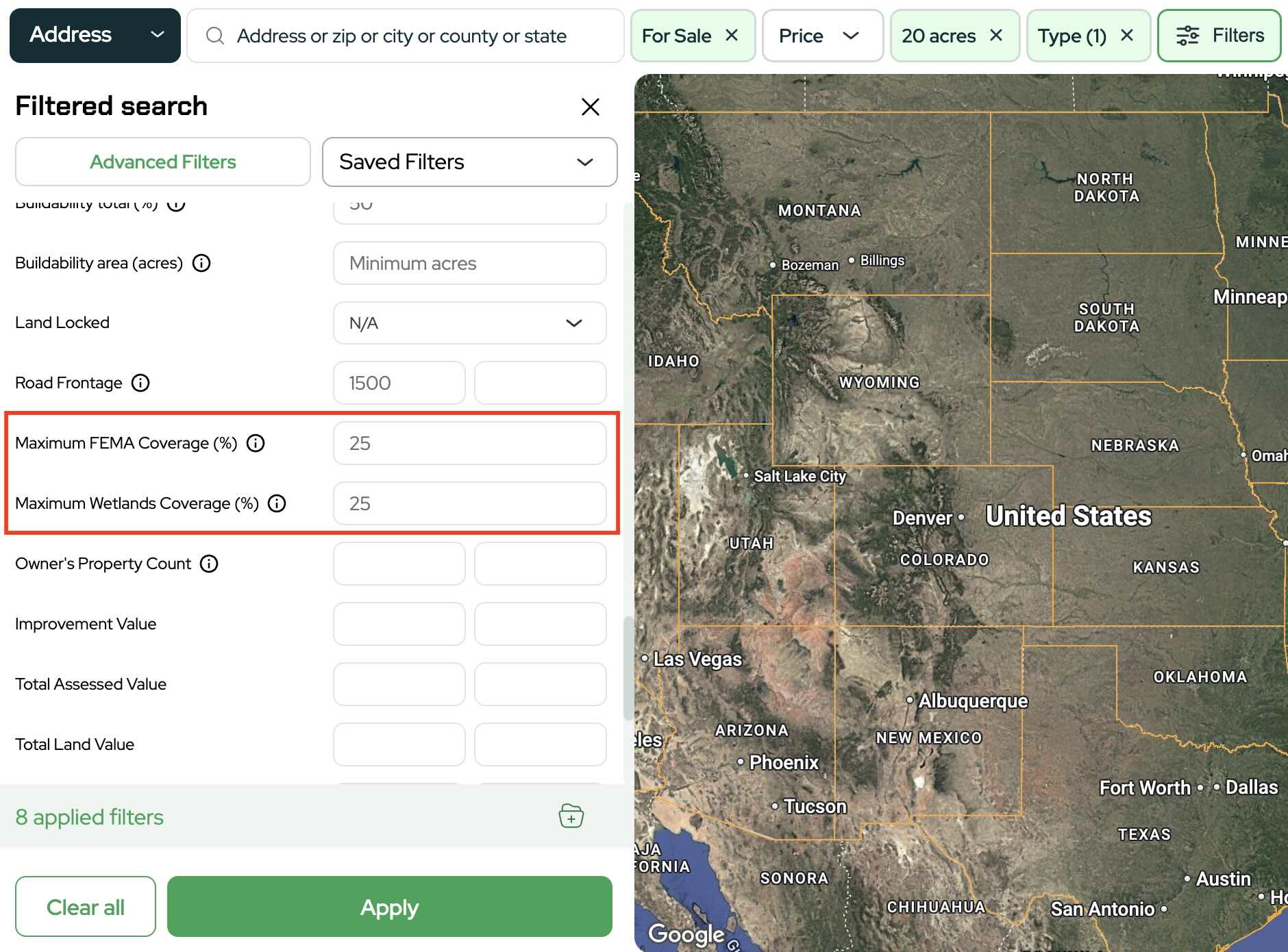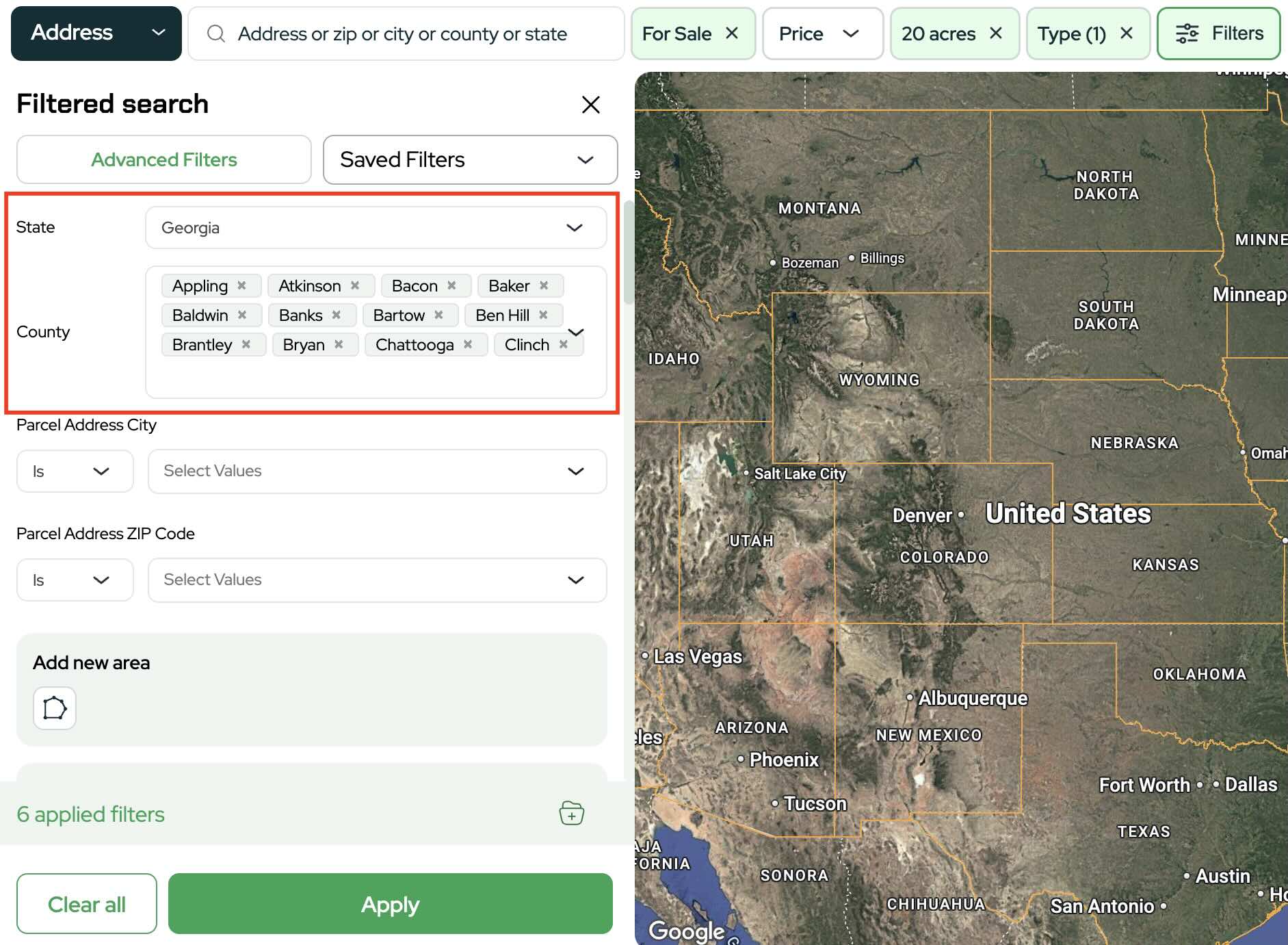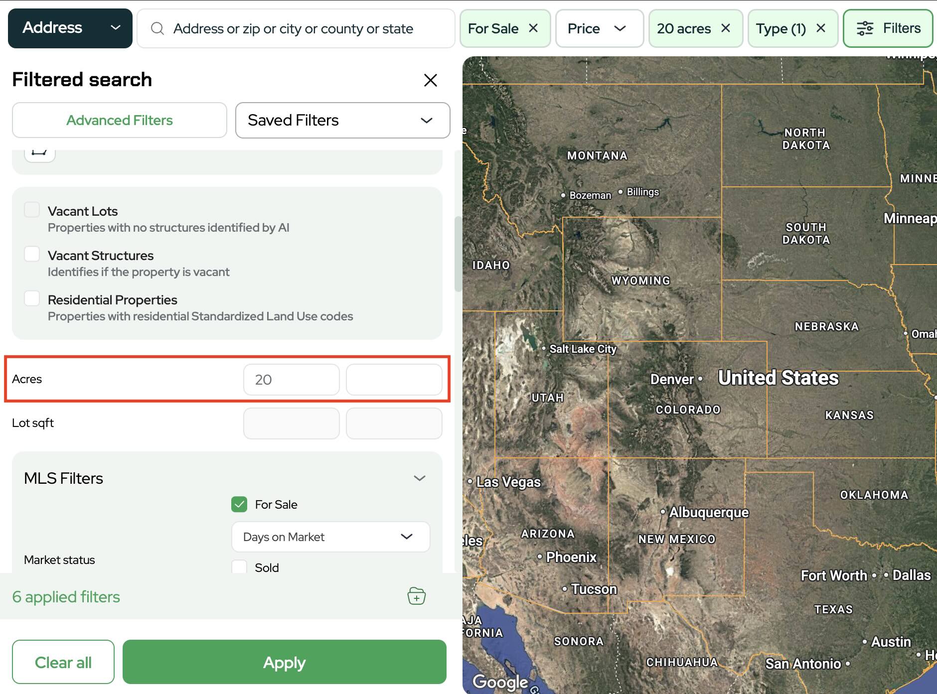 Next, locate the Acreage filter and set the minimum to 20 acres.