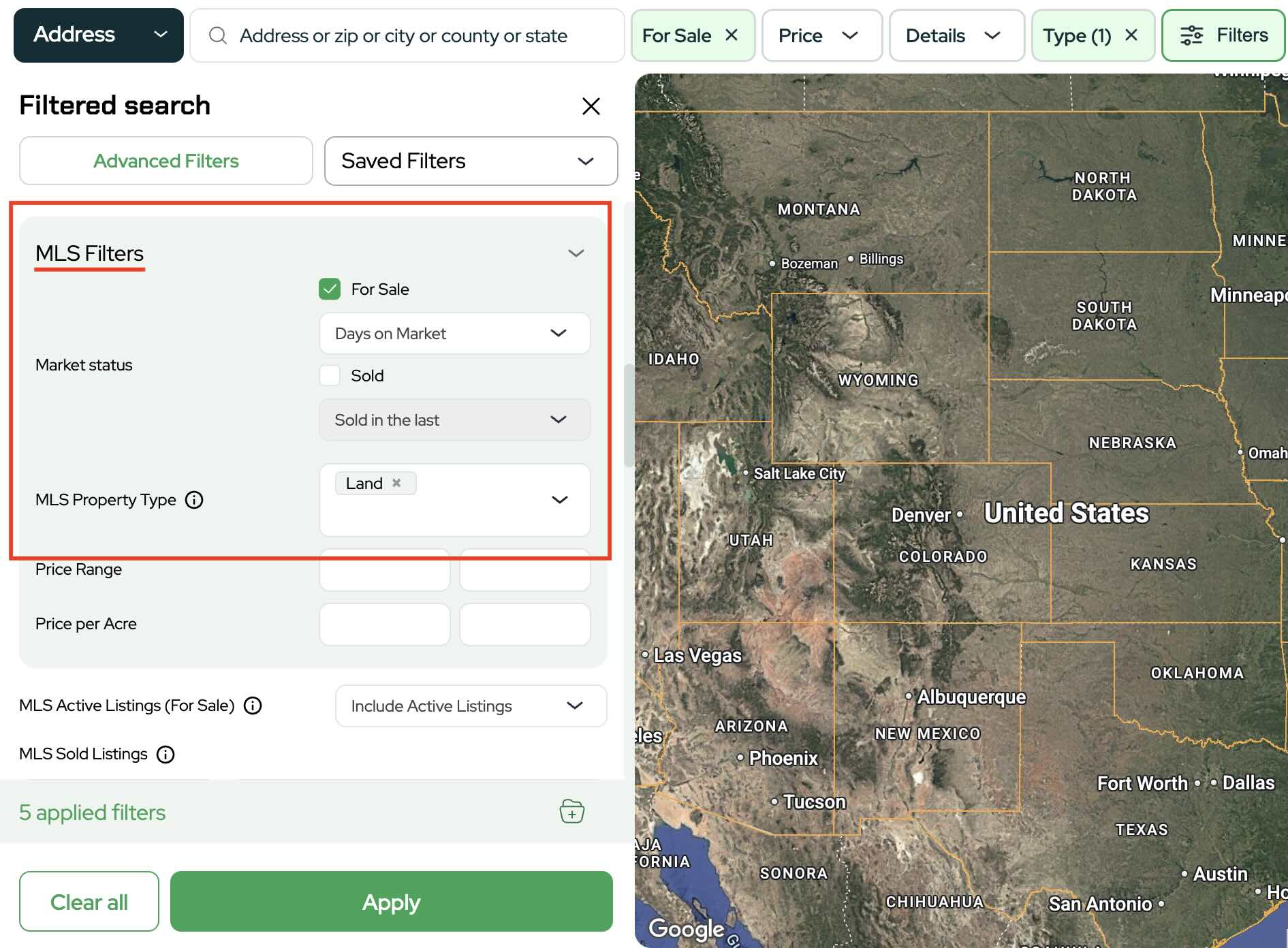 This ensures you are only seeing land listings that are actively listed on the MLS.