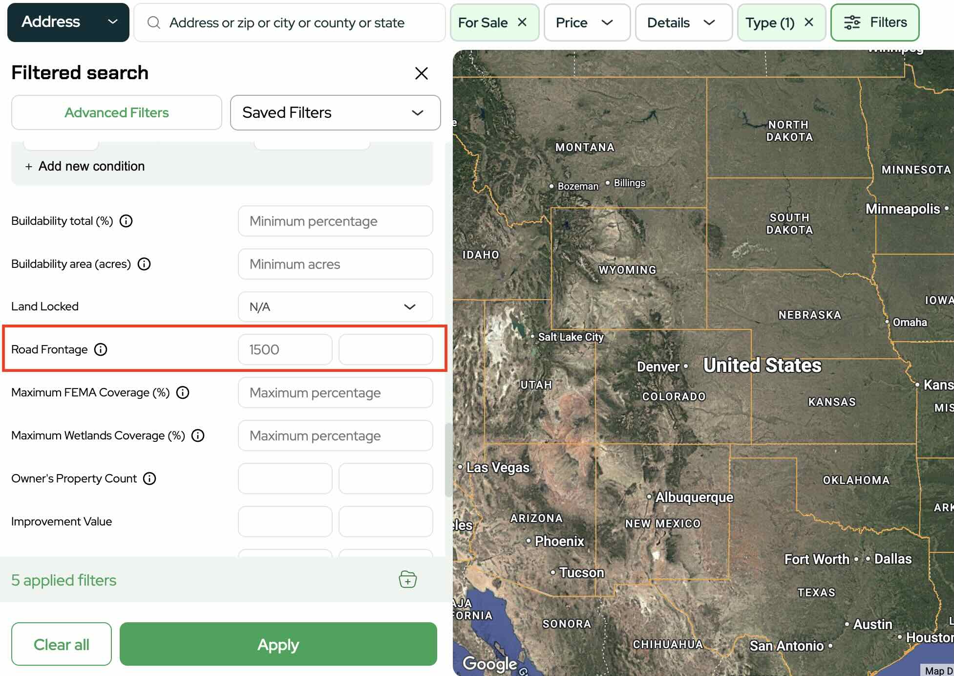 Most real estate platforms like Zillow or Realtor.com allow you to search for land that’s for sale, but they don’t allow you to filter for the factors that actually make land good for subdividing, things like road frontage, buildability, wetlands, and floodplain.