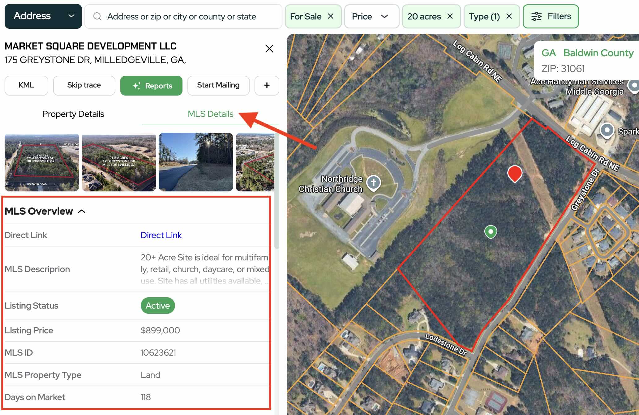 When you combine MLS listings with Land Portal’s advanced land filters, you can uncover opportunities that would be difficult to find on traditional real estate websites.