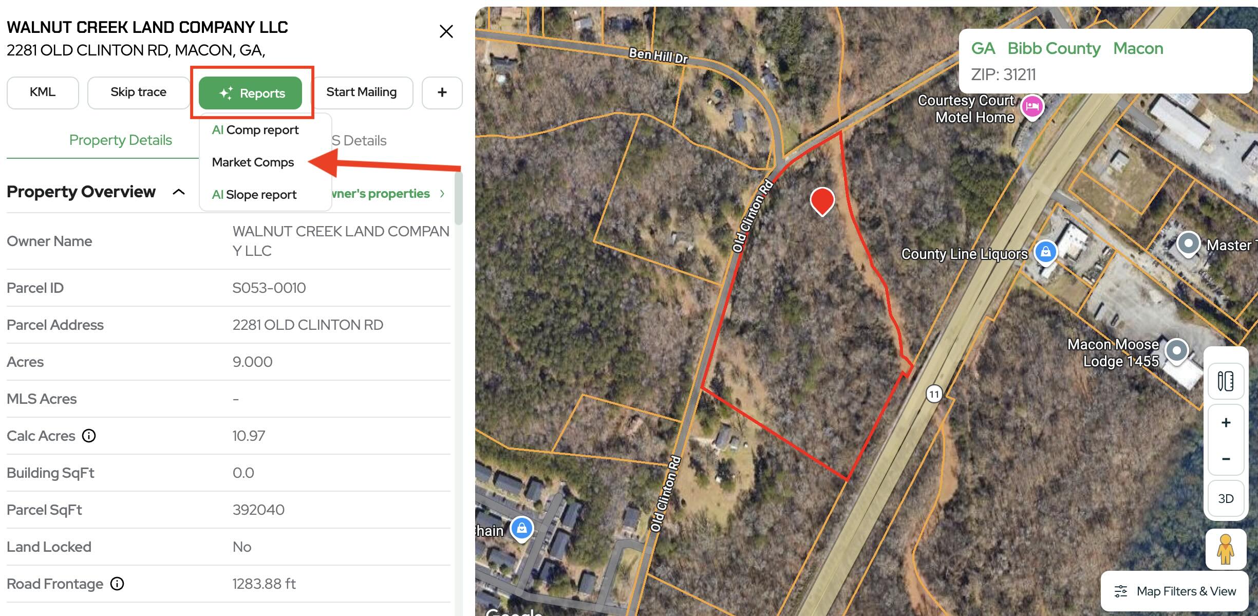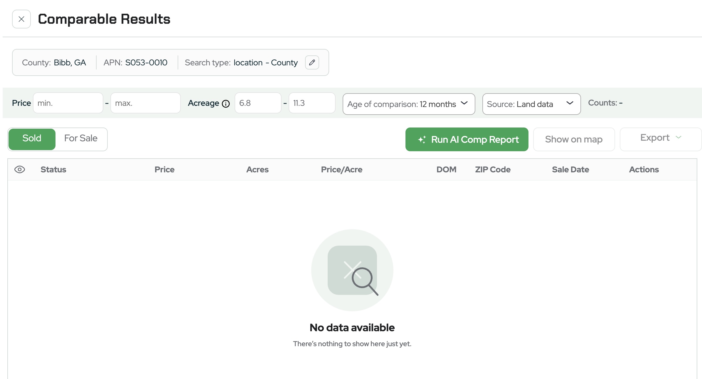 Unlike the AI Comp Report, which predicts a value automatically, the Market Comp Report allows you to manually adjust filters, review comparable properties, and analyze price-per-acre data to make more informed decisions.