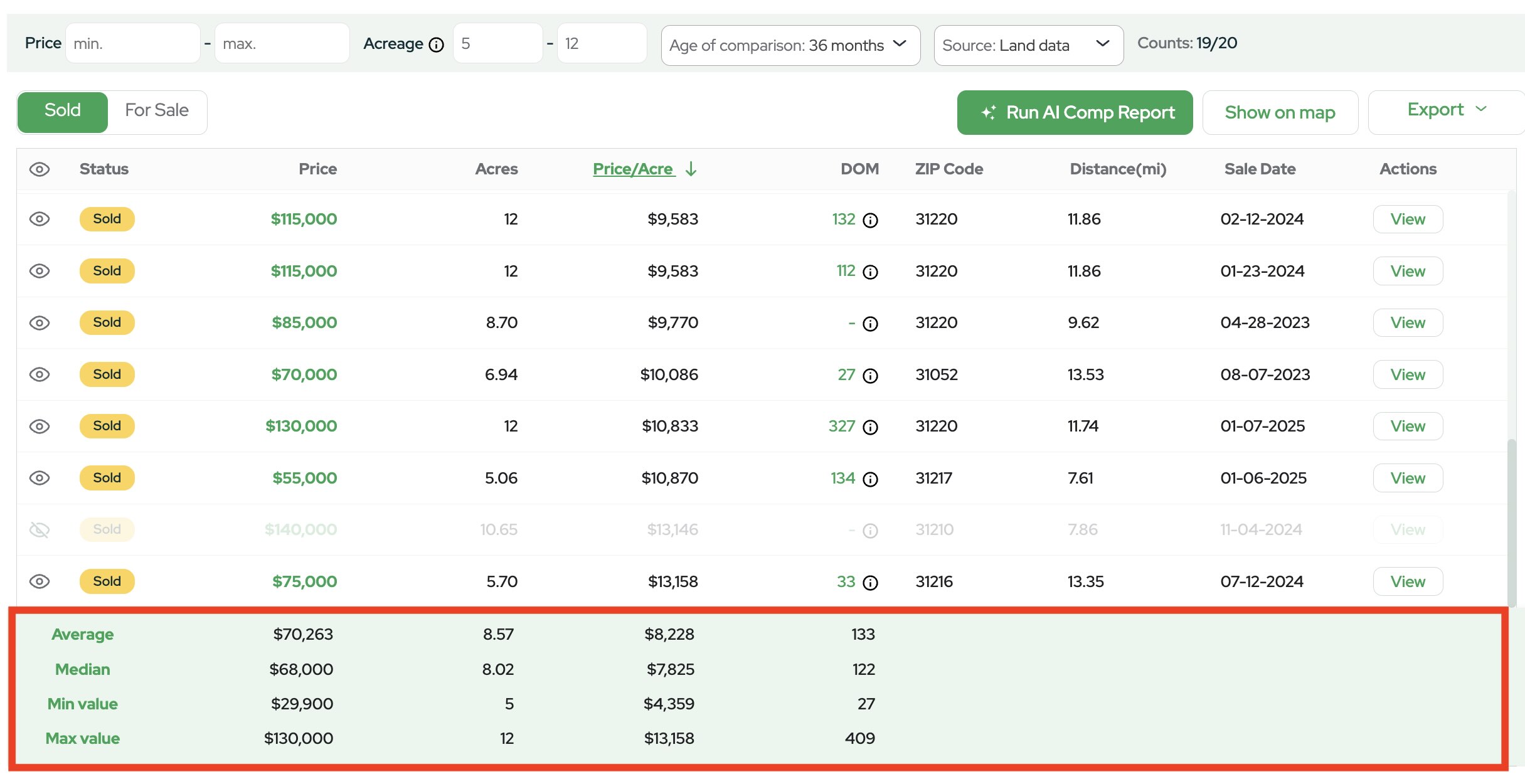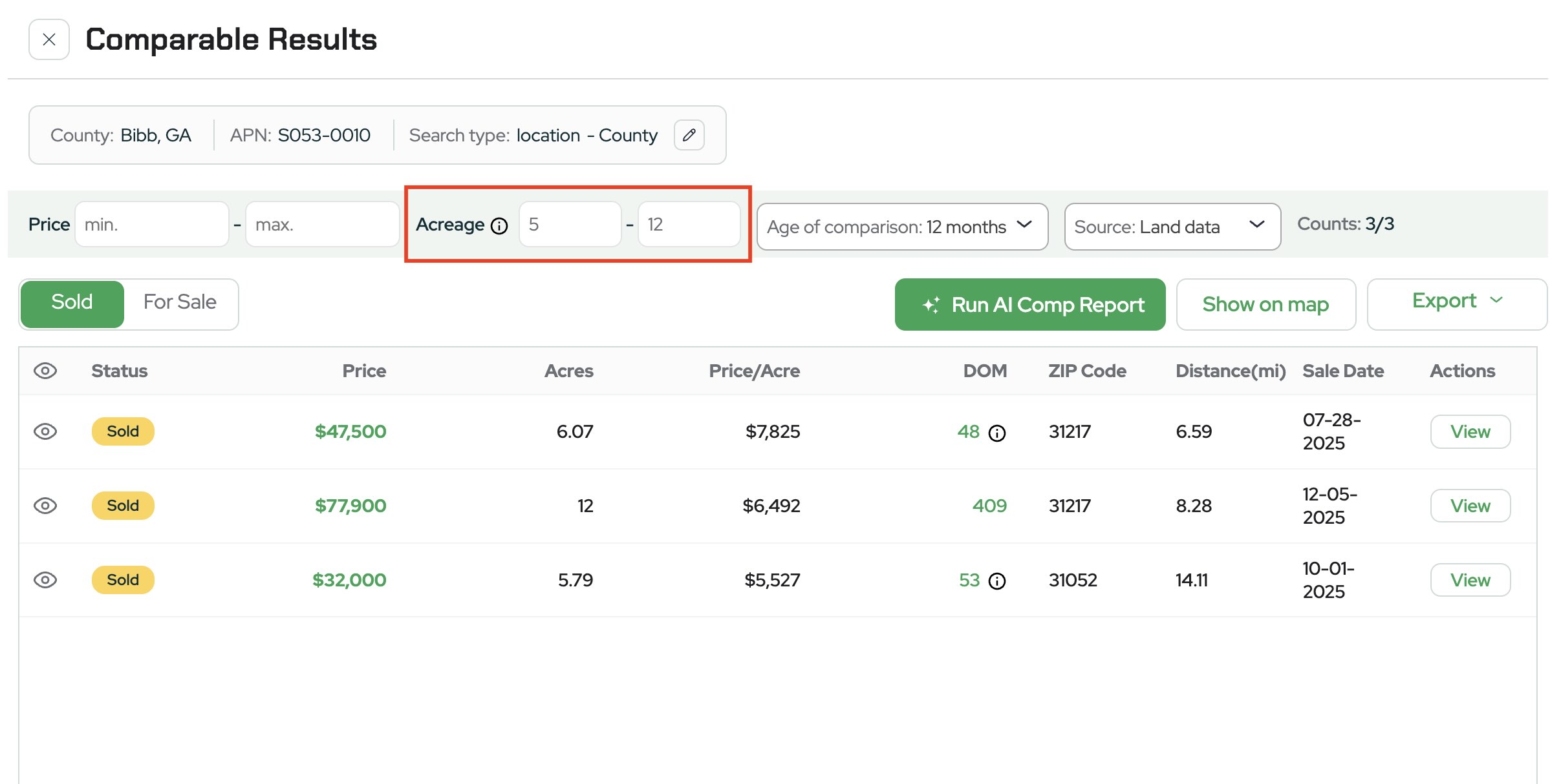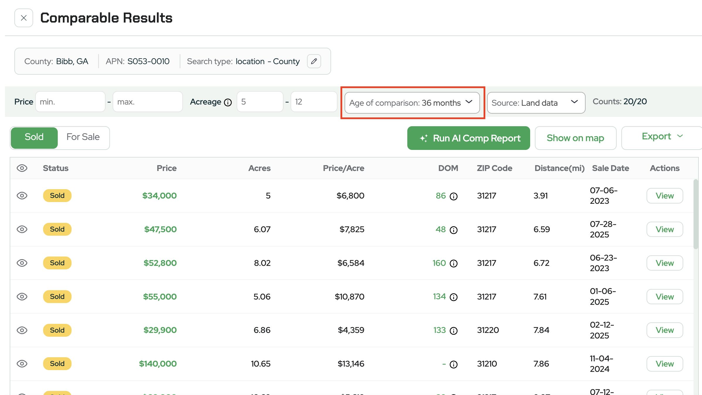 By default, the report shows comps within ±20% of the subject property’s acreage.