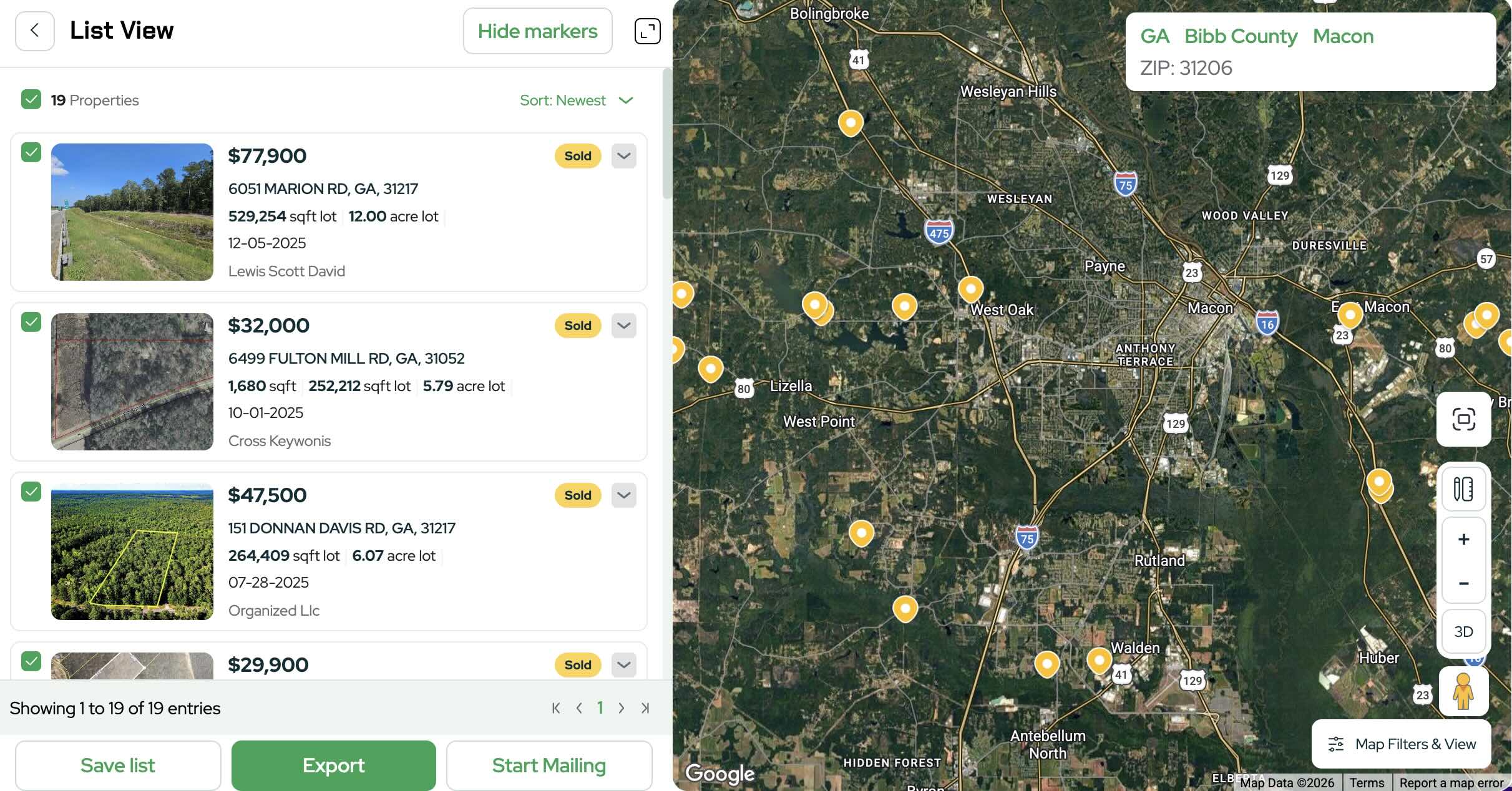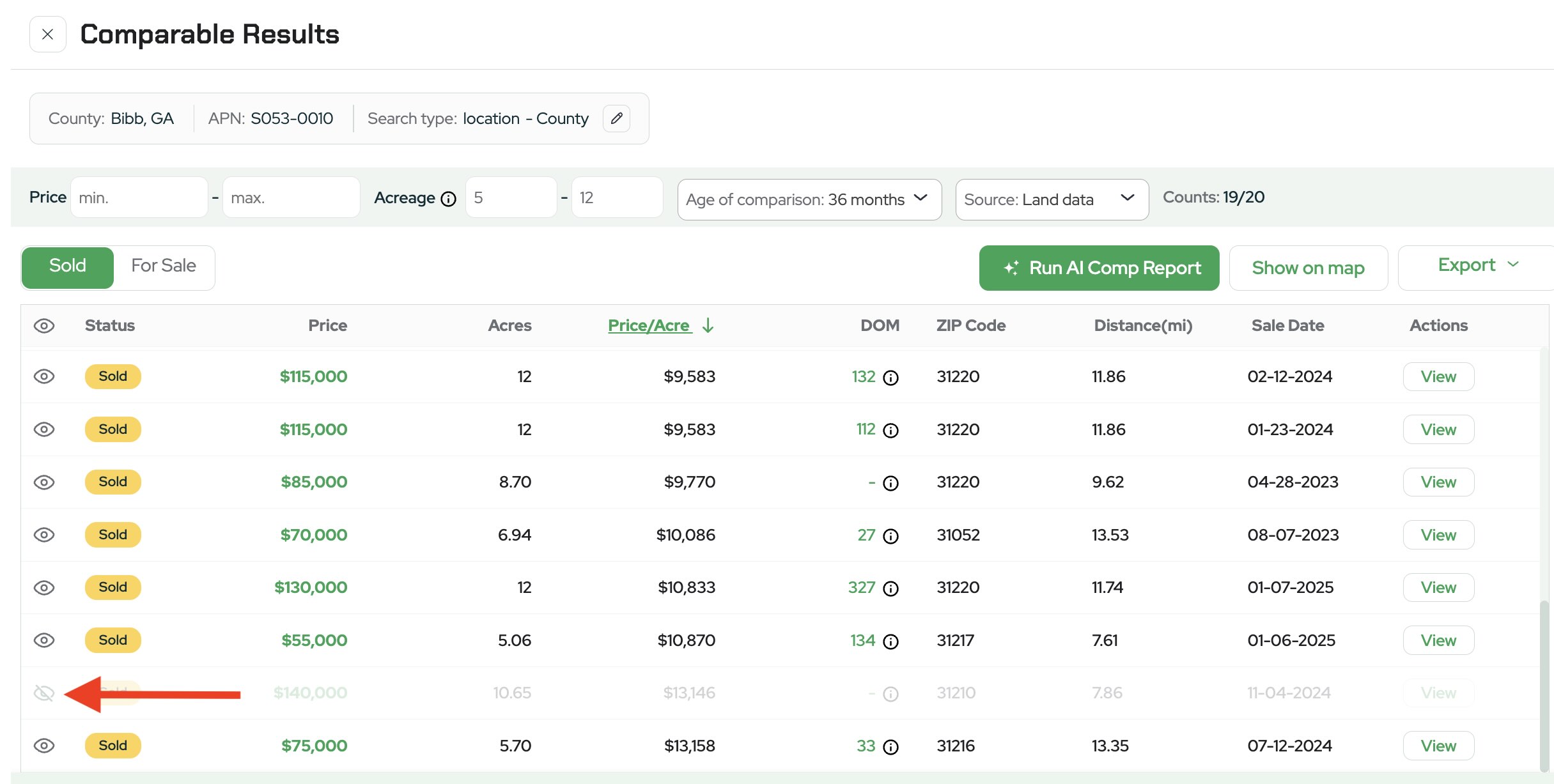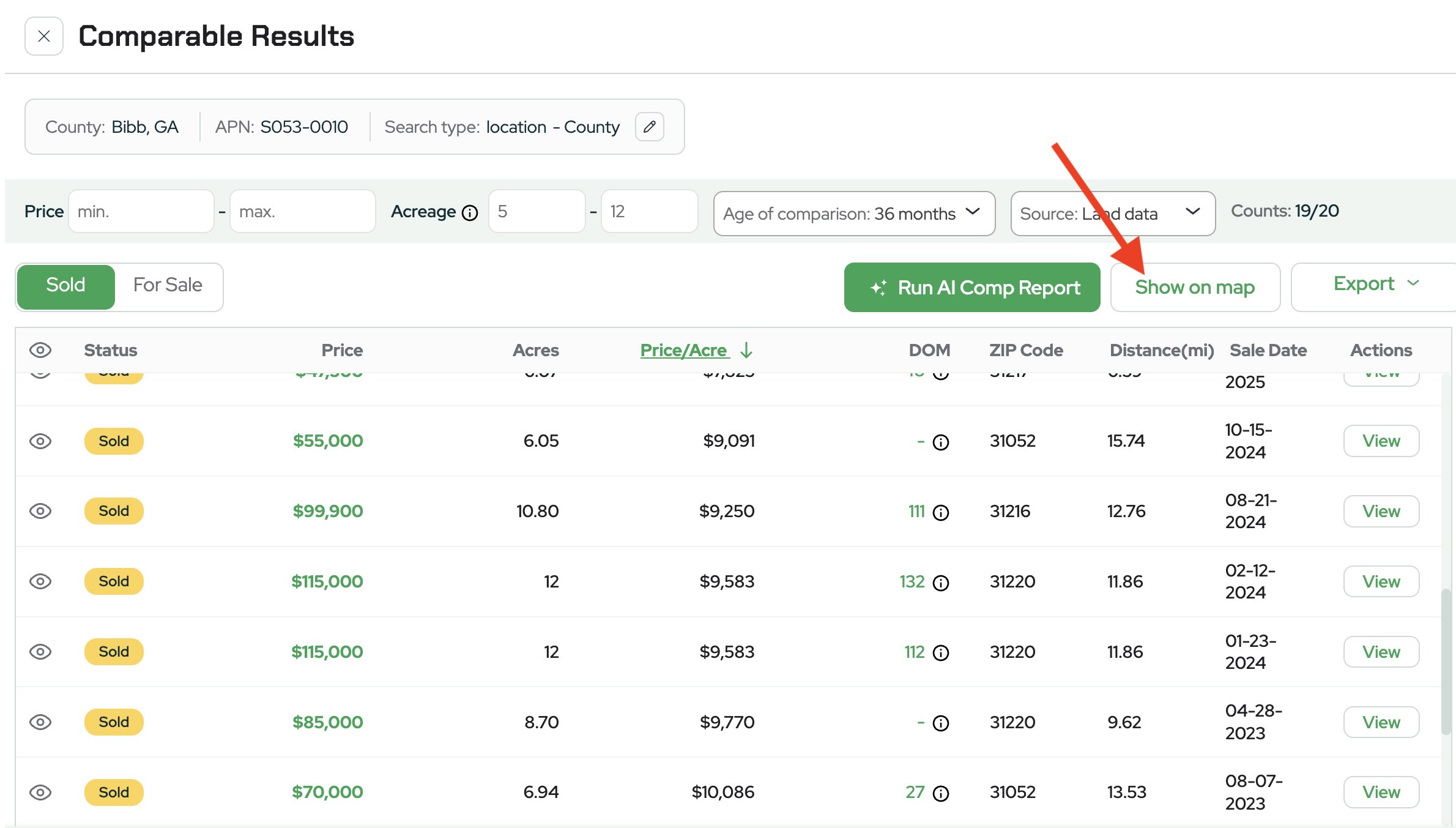This report analyzes comparable land sales within the same county and automatically pulls properties that fall within a similar acreage range.