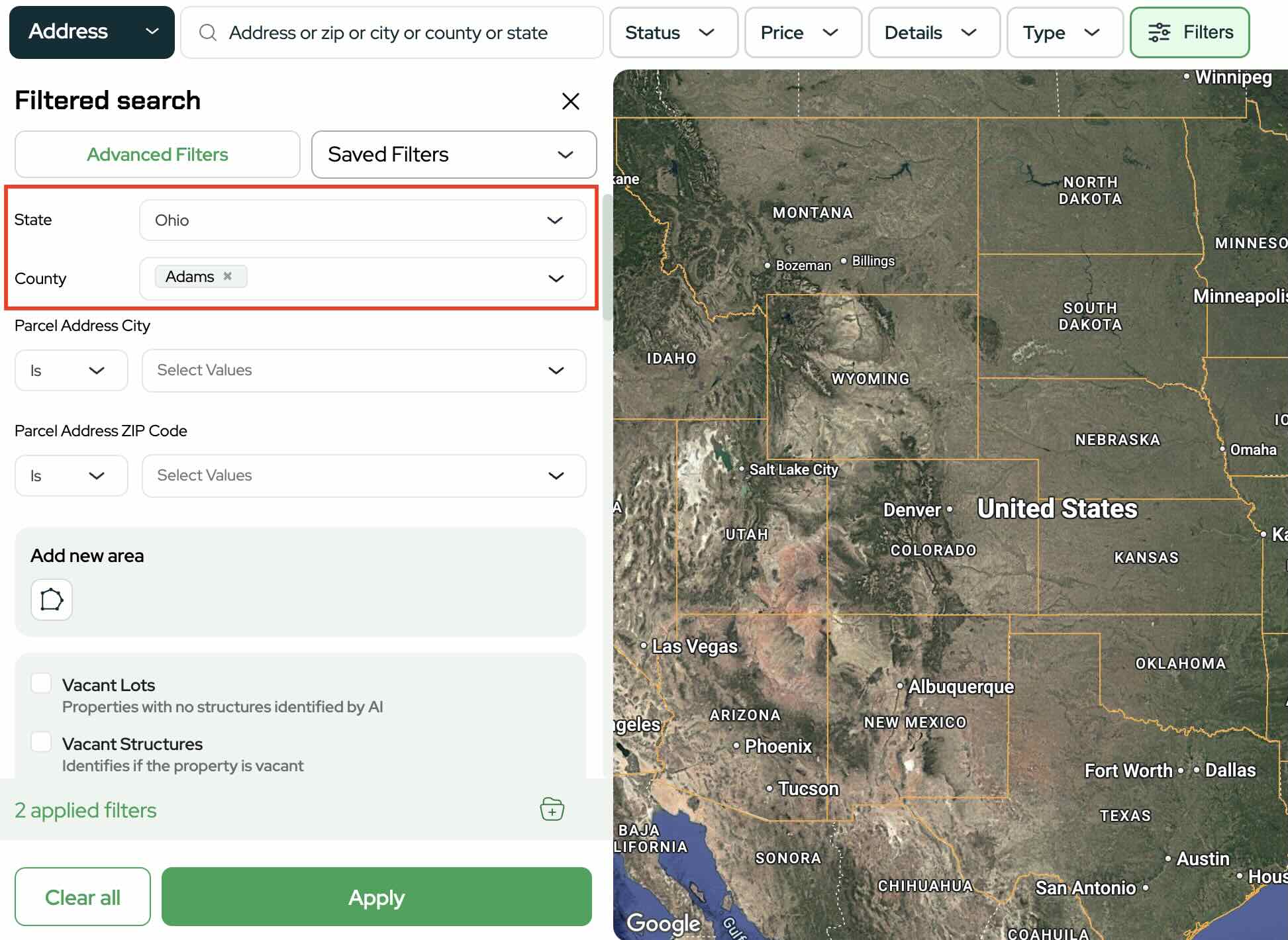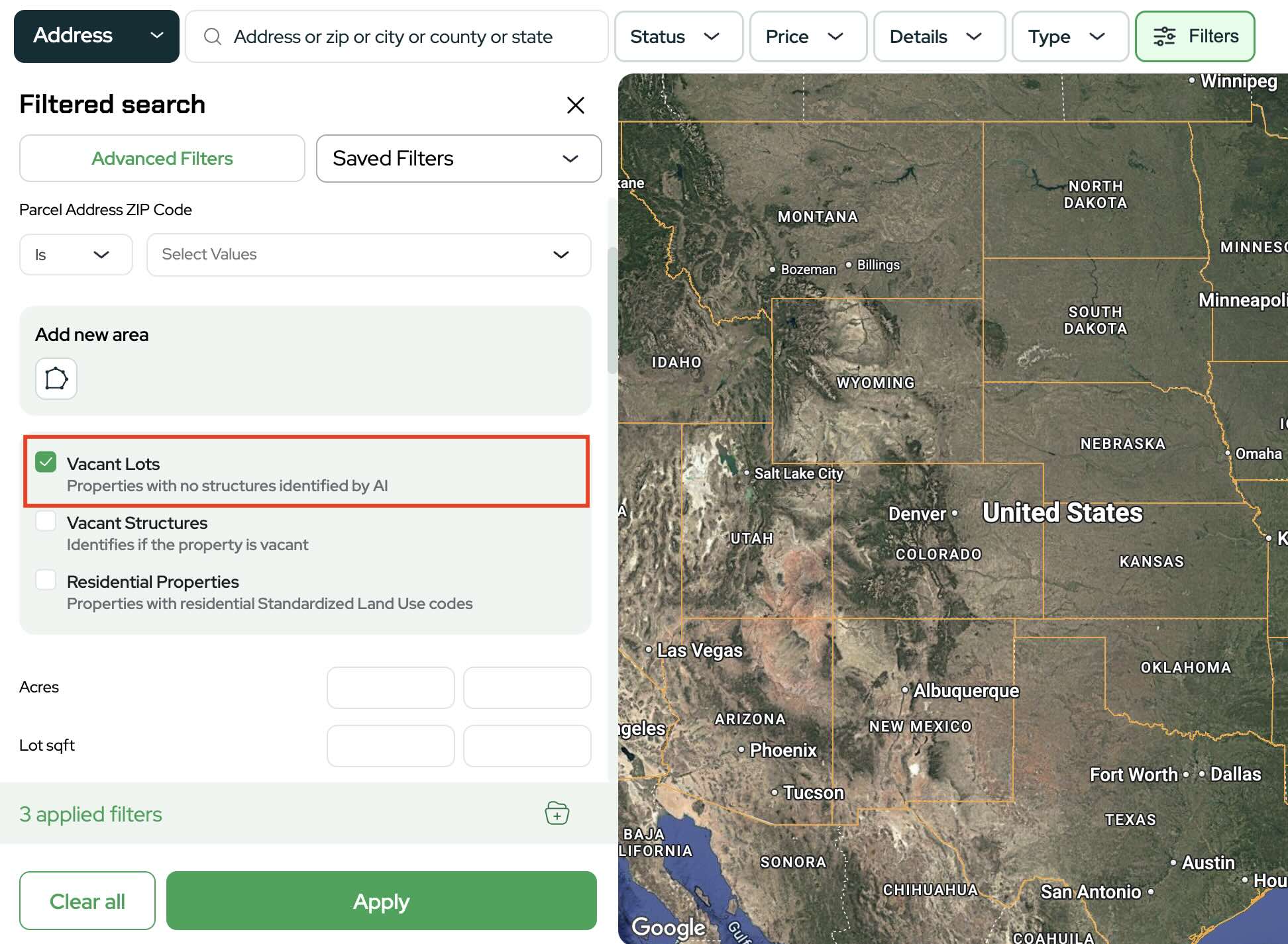 You can target vacant land or residential parcels. For this first search, select vacant lots.